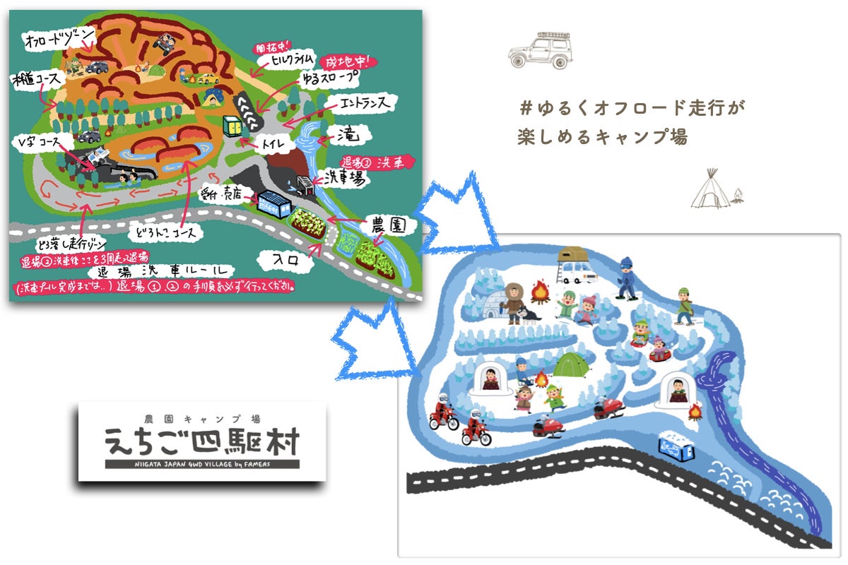 農地付きオフロードコース付きキャンプ場『農園キャンプ場 えちご四駆村』です。