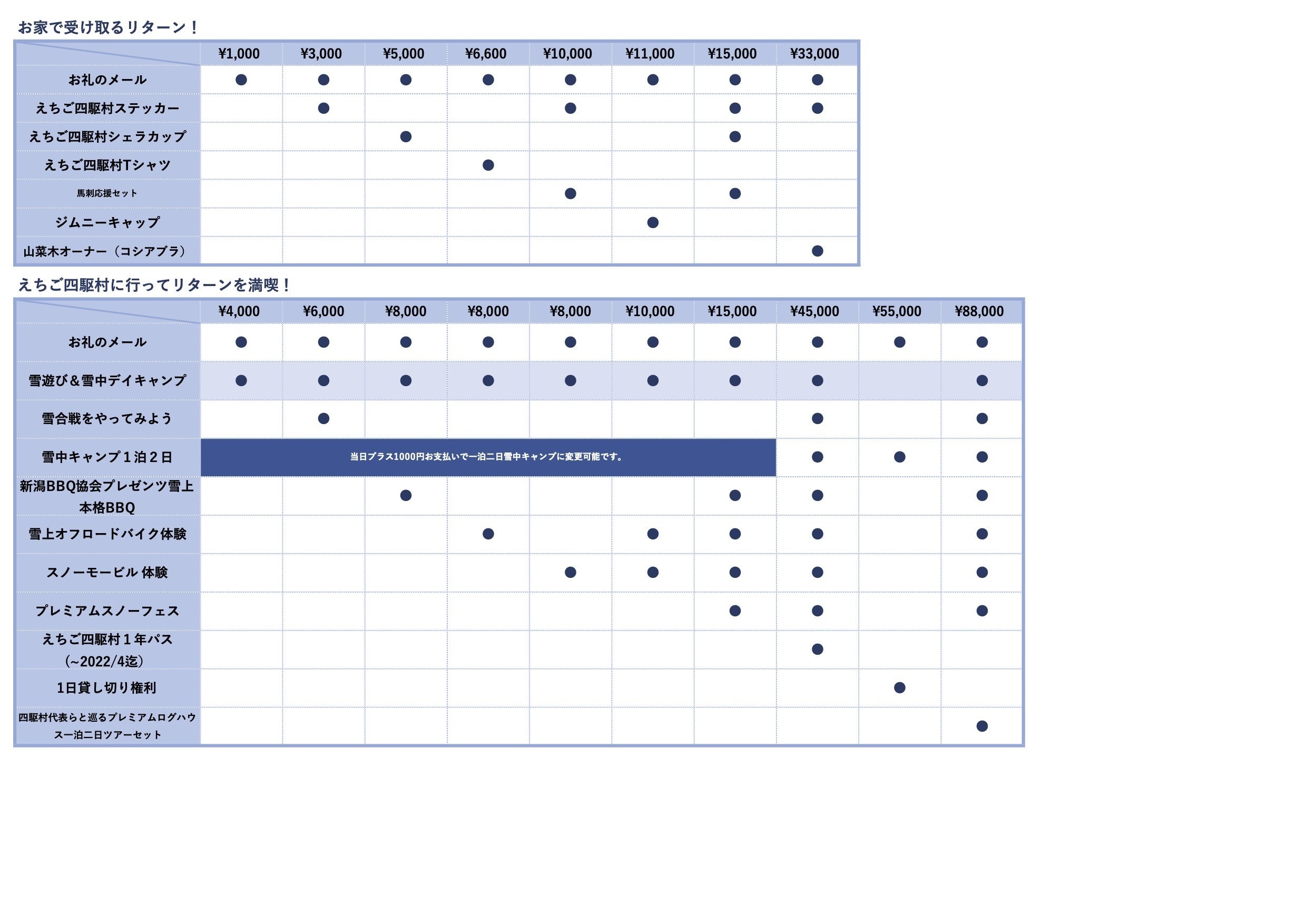 えちご四駆村に来れなくても、ご自宅で受け取れる、ご自宅から応援していただけるリターンも満載です。