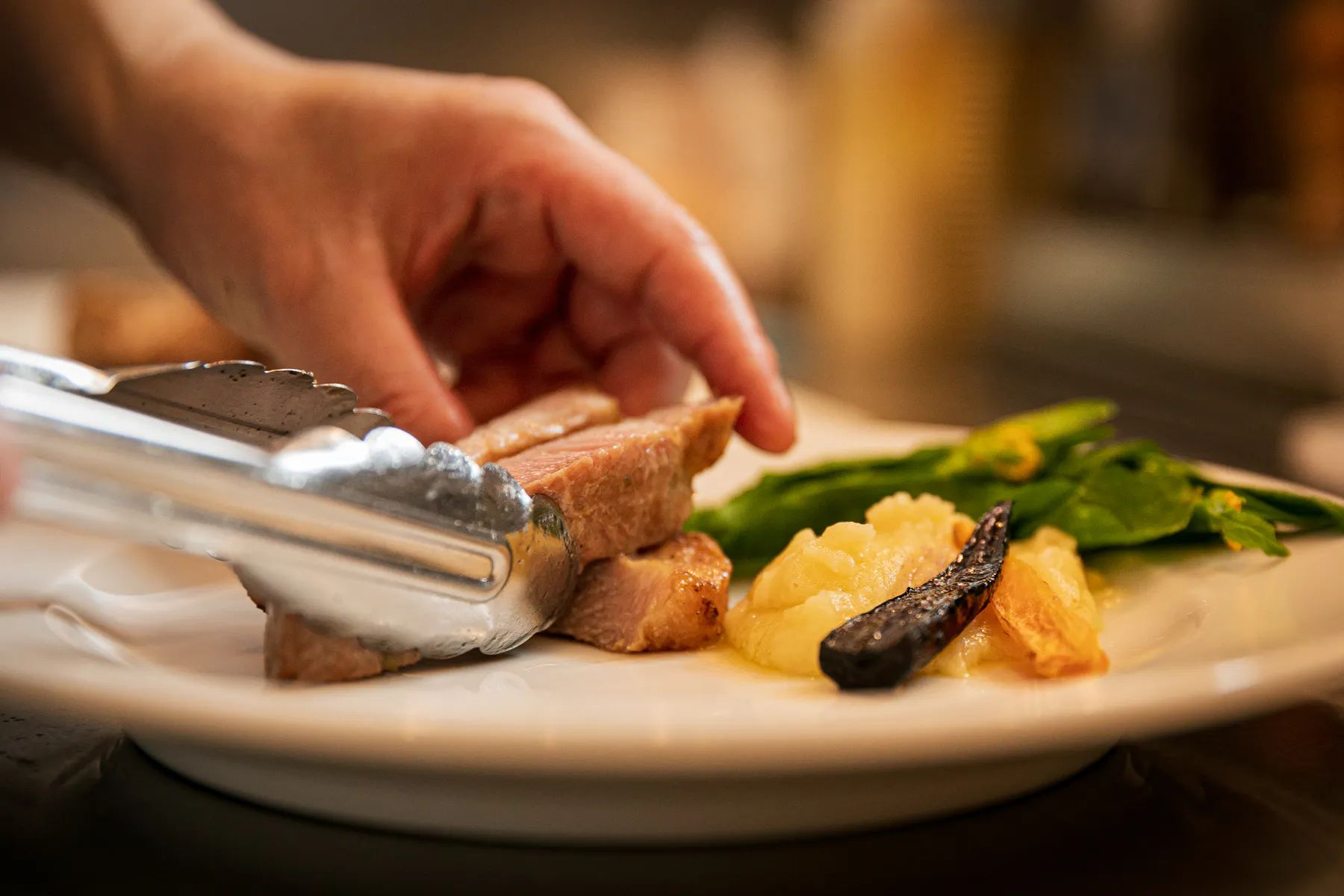 特に「 塩漬けいも豚肩ロースのロースト」は店主飯野のスペシャリテ。これは、「美食の街」として知られるフランス・リヨン地方の郷土料理を独自にアレンジした逸品で、適度に脂がのった豚肉は塩加減が絶妙。