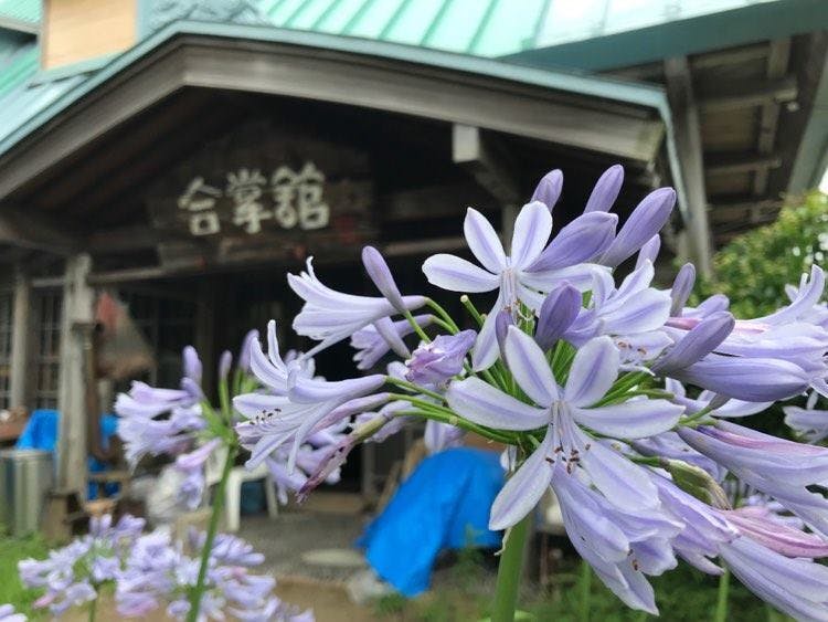 写真・合掌舘&アガパンサス :花言葉「ラブレター」