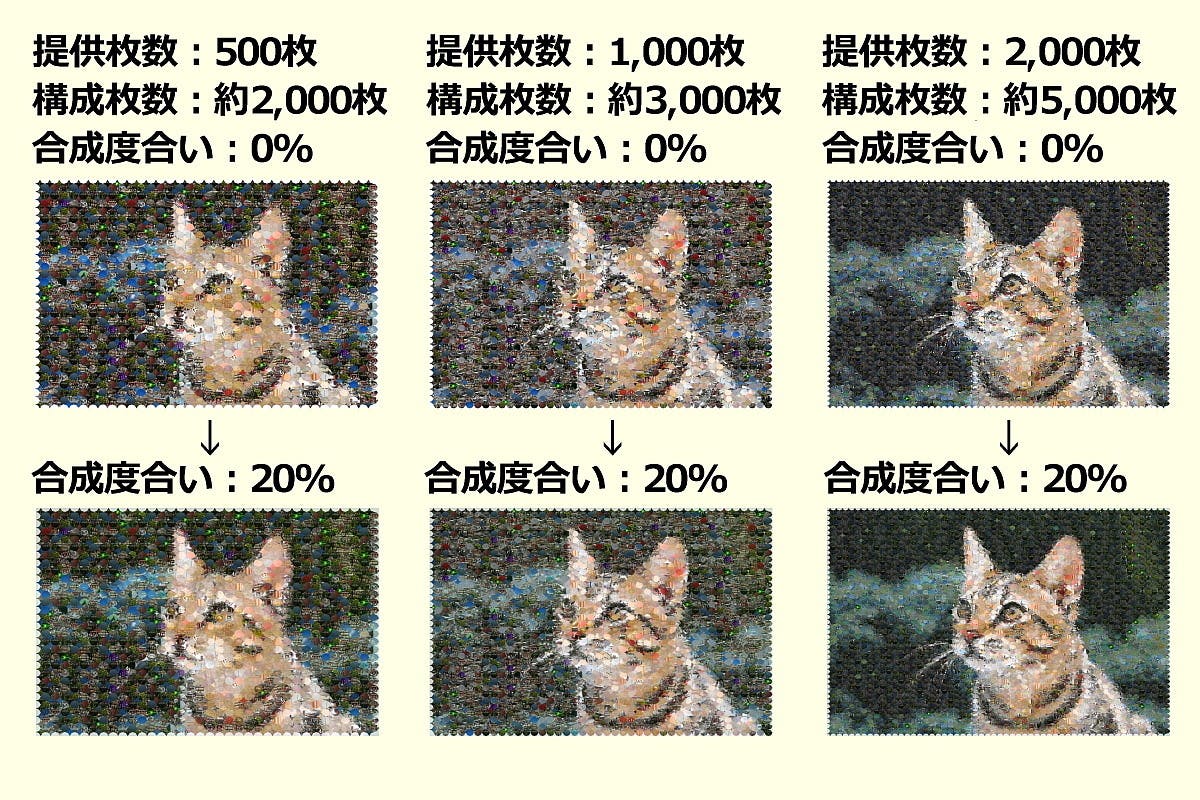 (2) 通常ベース画像を合成した方がフォトモザイクアートとしてきれいになりますので、合成無しのパターンから合成度合い70%くらいまでにしたフォトモザイクアートのサンプルを、ファイルでお送りします。(当社Webサイトからのダウンロード)