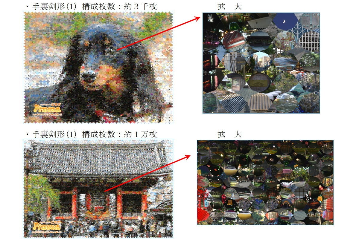 現在開発を進めている段階ですが、「手裏剣形」の試作品ができております。これら試作品は、多数の写真を使用して、このフォトモザイクアートのベース写真の埋め込みに適した写真のみ重複利用して作っています。(ベース写真や埋め込み用写真、構成枚数等により、モザイクアートの出来映えが違ってきます)