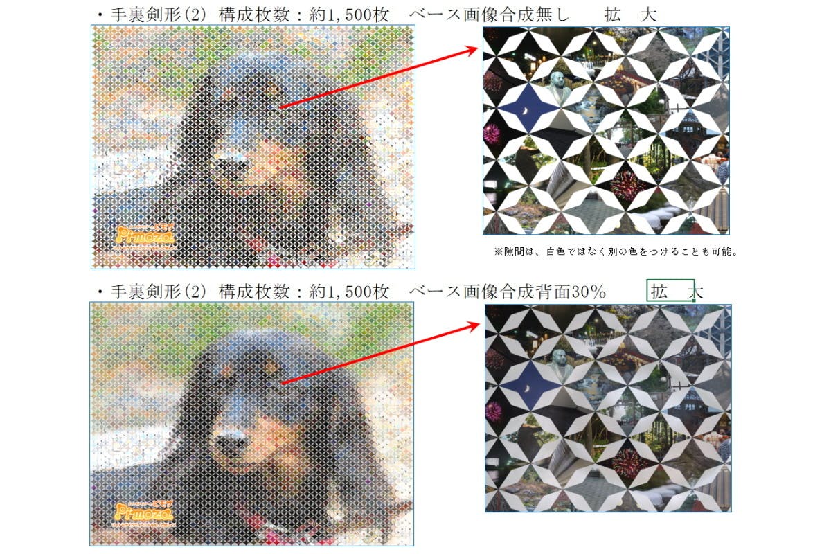下の試作品も「手裏剣形」 で、手裏剣形のみのフォトパーツでフォトモザイクアートを作っています。手裏剣形の間は隙間が空いていますが、その場合のフォトモザイクアートも見映えも面白く、ベース画像を前面、または背景として合成した場合はフォトモザイクアートがより見やすくきれいになります。