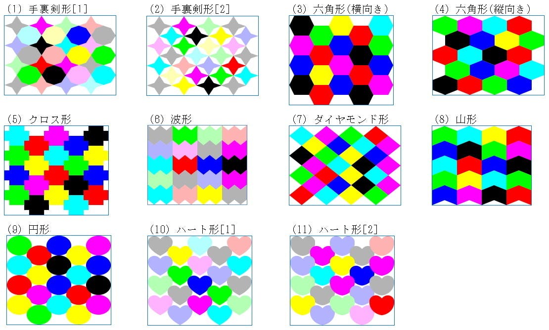 埋め込まれる写真の形が違えば、モザイクアートの見映えも変わり、また写真一枚いちまいを見るときの楽しさも増します。下の新しい写真の形のサンプルは、色がついている形一つひとつが写真になります。「円形」、「ハート形(1)」、「ハート形(2)」については、隙間を少なくするために下の画像のように写真を少し重なるようにする予定です。