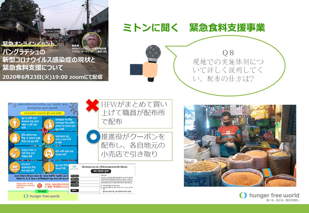 6月23日(火)、バングラデシュのダッカ事務所からミトン支部事務局長が報告したバングラデシュのコロナ禍の現状とハンガー・フリー・ワールド(HFW)の緊急食料支援について2回に分けてご紹介している後編の今回は、HFW独自の緊急食料支援がどのように実施されたのか、困難や協力体制についてご紹介します。