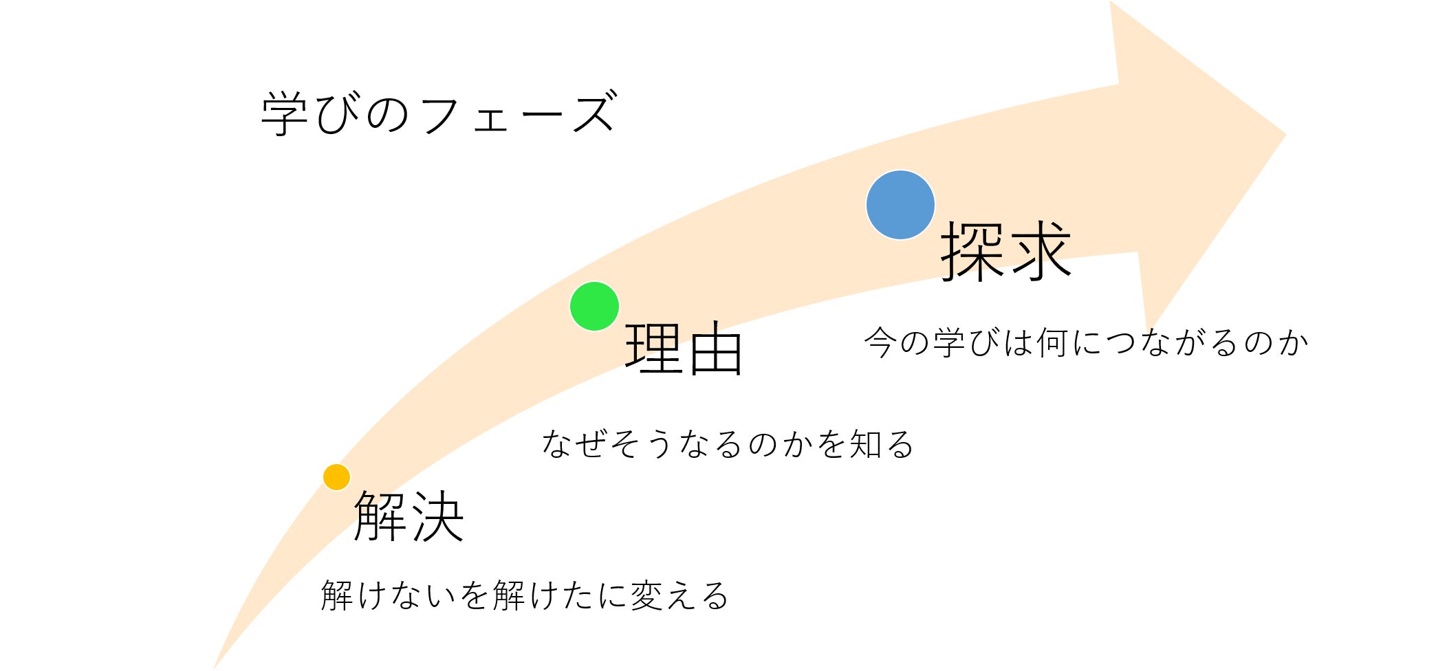 学びには、図のような流れがあると考えます。このうち、現在のほとんどのWebコンテンツでは、解決・理由を得ることができます。私たちはその先、探求までをコンテンツに含めたいと考えています。解決・理解は問題ベースの解説記事で、探求は学問分野に分けて探求記事を作成する予定です。