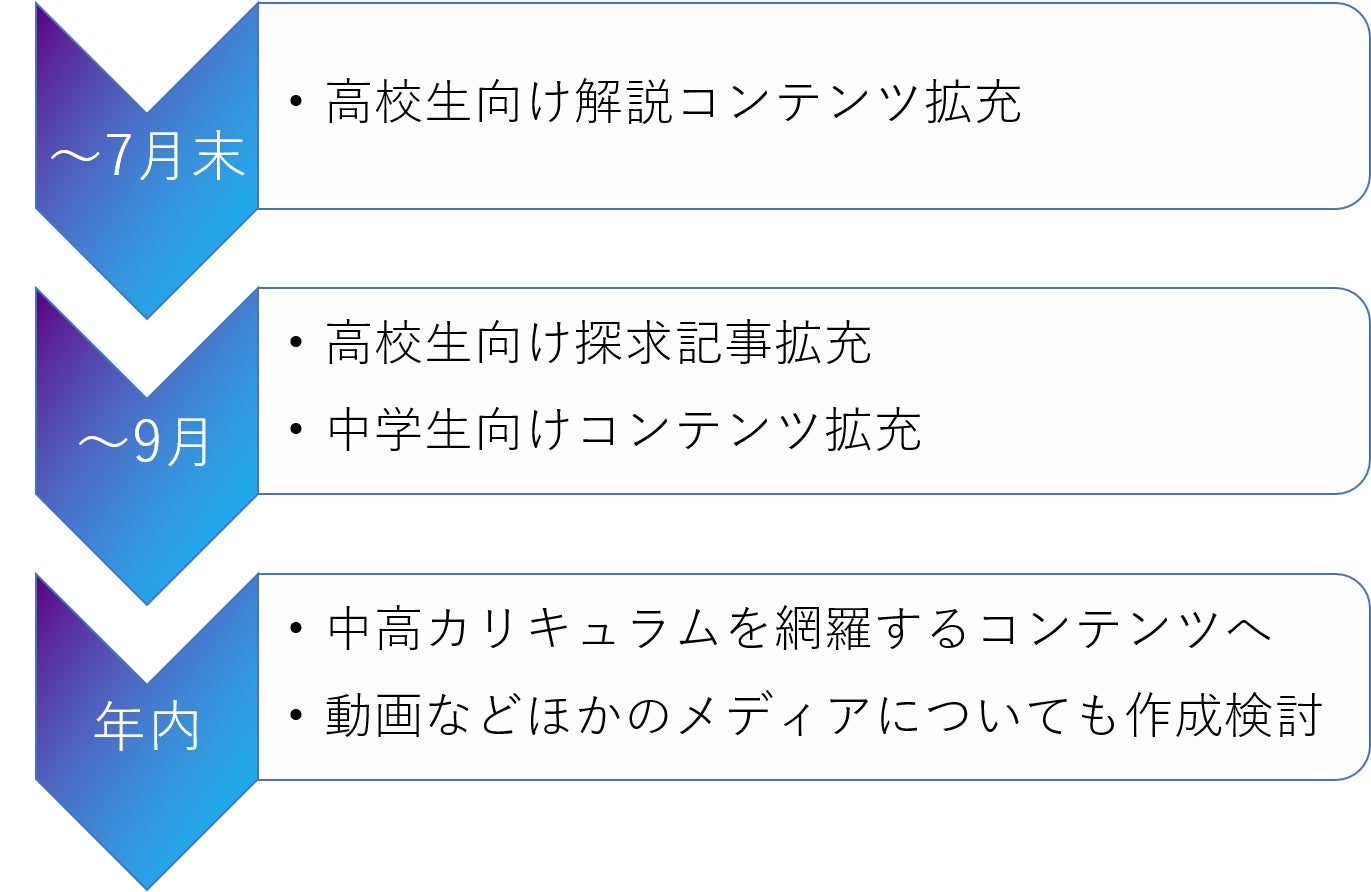 コンテンツ作成の大まかなロードマップです。最終目標は中高ともに指導要領に掲載されているカリキュラムを網羅することです。まずは、高校生向けのコンテンツから作成し、その後中学生向けコンテンツを作成していきます。いずれは動画コンテンツなど様々なメディアで展開をしていくことを考えています。