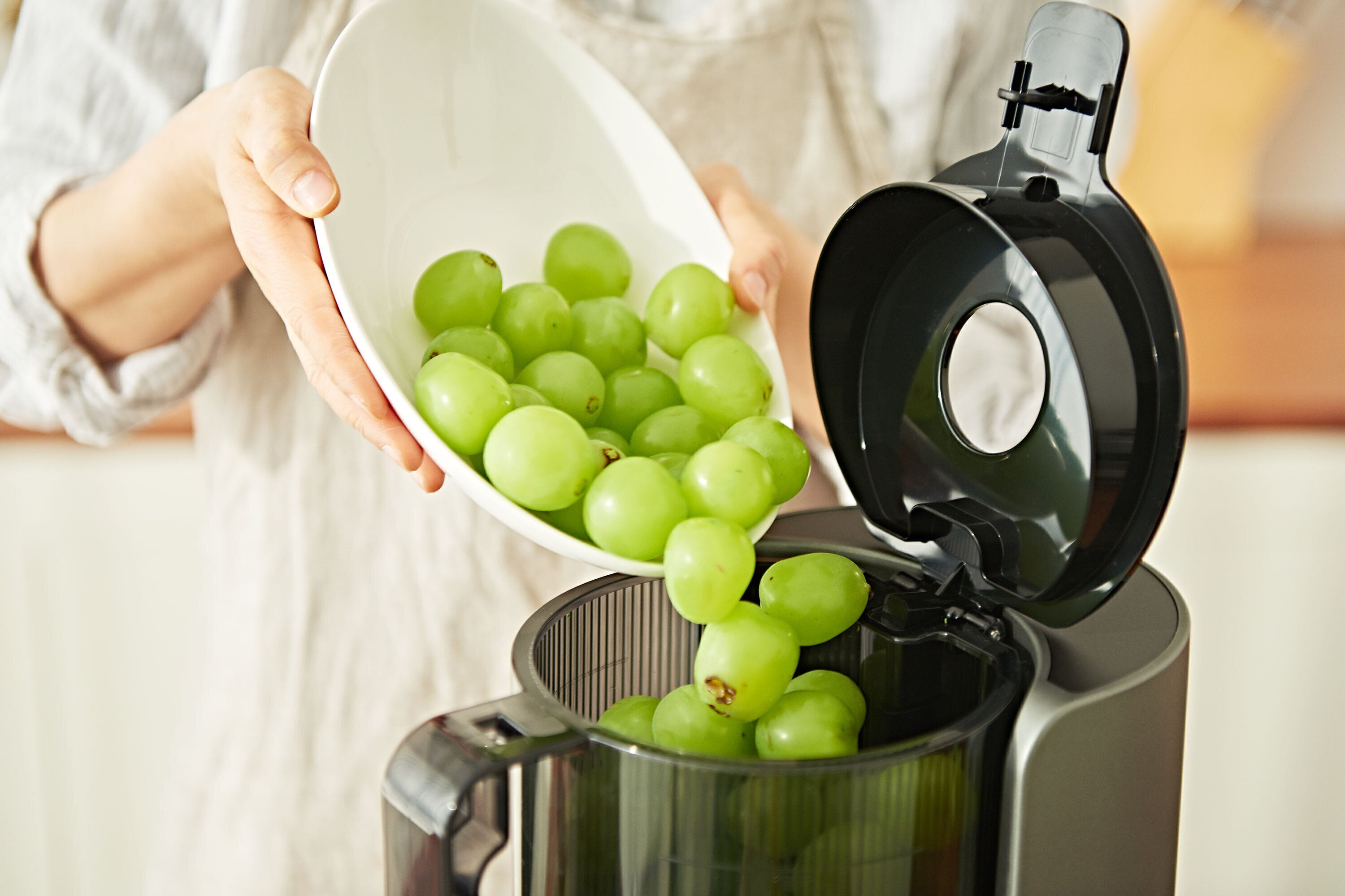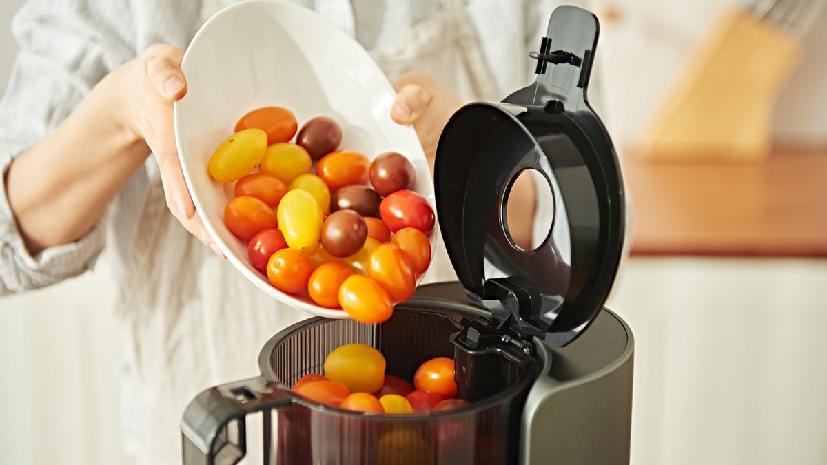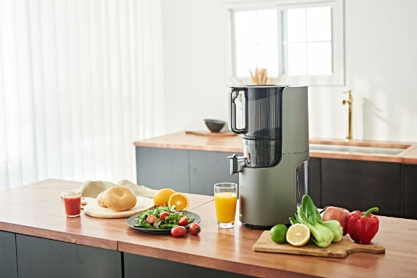 ミキサーは食材を刃で細かく切り刻むのに対し、スロージューサーは食材を、ゆっくり、ぎゅっと圧し搾るところが特徴。野菜やフルーツに含まれる水分を最後まで搾りきるため、そのまま食べるよりもはるかに濃厚な味わいを楽しむことができます。