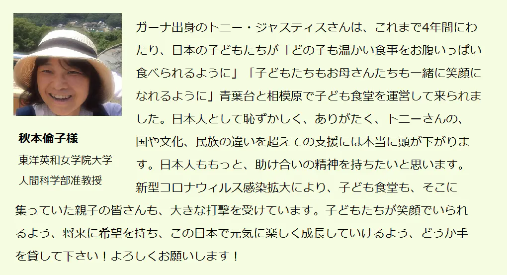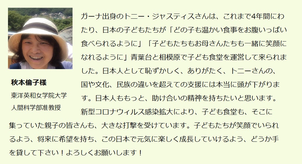 トニーさんは、今までと同様簡単には投げ出さず、子どもたちの笑顔のために続けてくれると信じています。皆様のお力で実現させてください。ご支援をお願い致します!