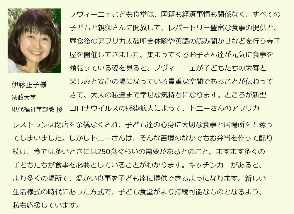 3トン車キッチンカーを購入し、困っている子ども達に冷たいお弁当でなく温かい食事を届けたい。英語やアフリカの文化を伝えるグローバルな学びの寺子屋を再開したい。