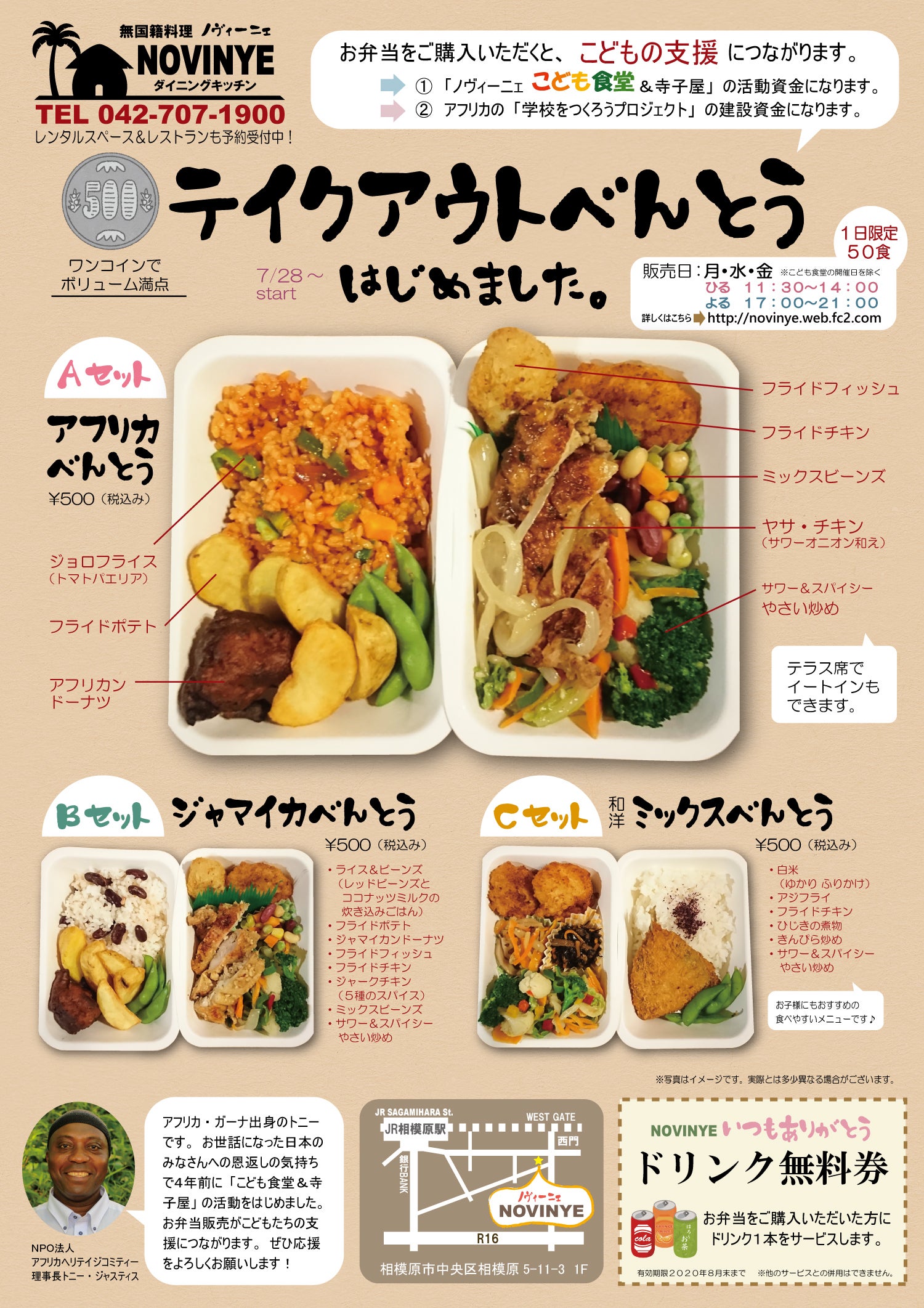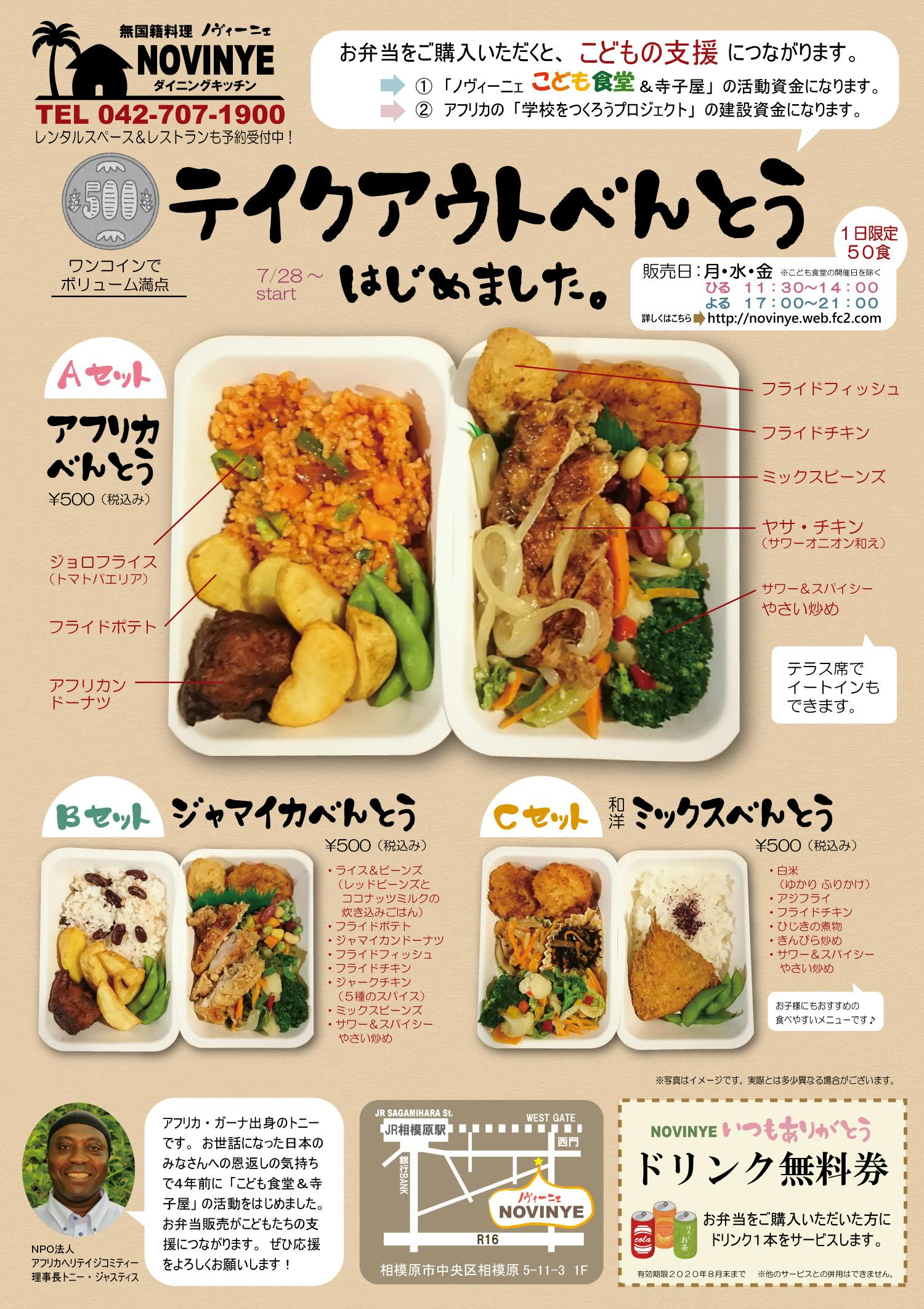 2020/08/26 08:33アフリカヘリテイジコミティ―のノヴィーニェでは、アフリカ料理などテイクアウトのお弁当をワンコイン500円で販売始めました。売り上げはこども食堂&こども寺子屋や、アフリカの学校をつくろうプロジェクトの支援にもつながります。ぜひご利用ください。トニーがお待ちしています! 営業日 月、水、金 11:30~14:00, 17:00~21:00相模原市中央区5-11-3きめたハウジング第5ビル もっと見る