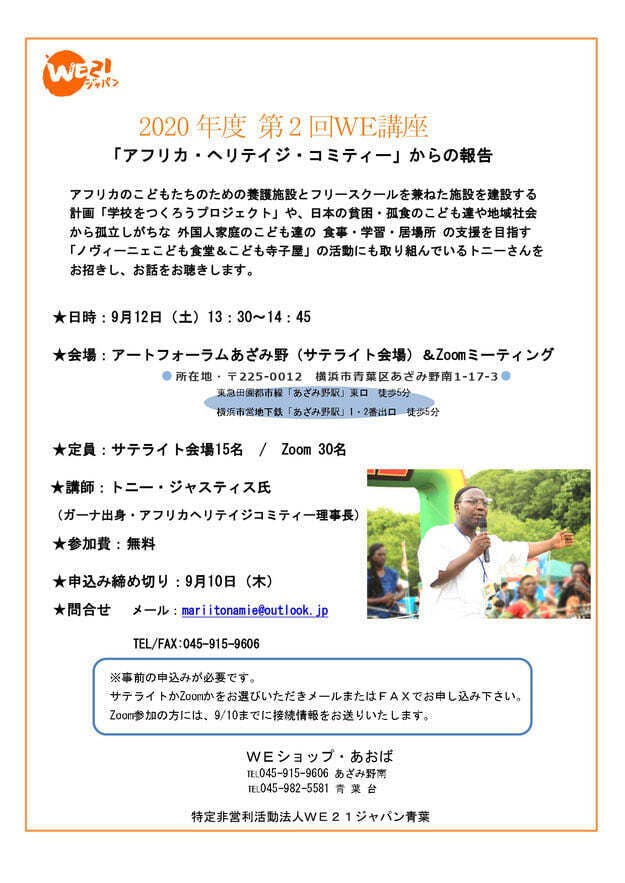2020/08/28 07:18特定非営利活動法人WE21ジャパン青葉主催9月12日 13:30-14:45Zoom と アートフォーラムあざみ野でご参加いただけます。アフリカに学校をつくろうプロジェクトは今年3月から再開の予定でしたが新型コロナで中断しています。ぜひご参加ください。また、クラウドファンディングは明日8月29日までですが、達成できるまで継続します。ぜひ拡散&ご支援をよろしくお願い致します。 もっと見る9月から青葉台のお弁当配布場所が変わります。