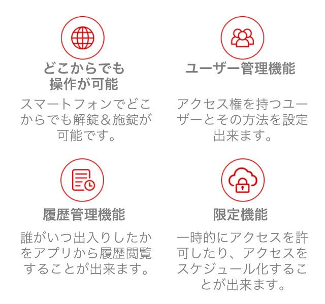 アプリを使っての解錠・施錠、また、一時的なアクセスキーを作ることもできるので、一定期間だけ鍵を渡したいゲストハウスなどでも活用できます。