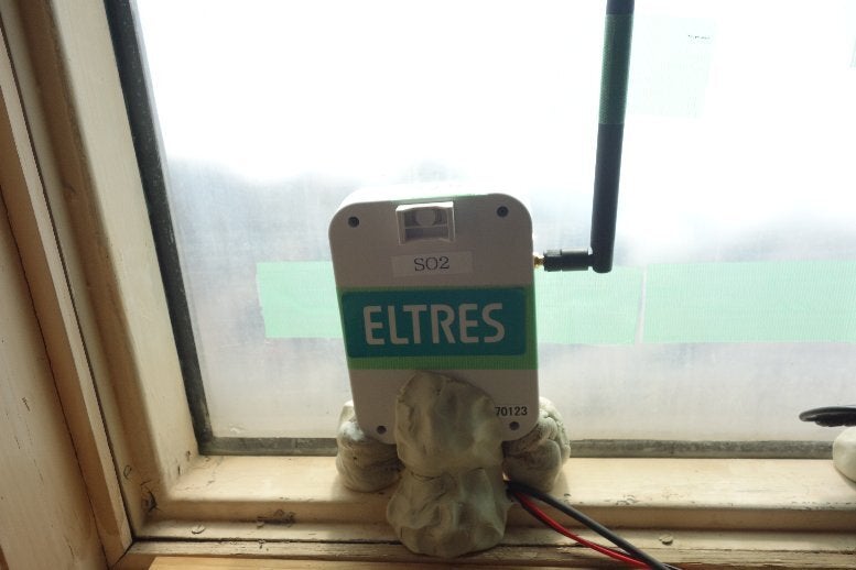 昨年の夏の終わりに山頂の富士山測候所内に火山性ガス(二酸化硫黄:SO2)を測定するセンサーと通信機器(ELTRES)を設置しました。商用電源が利用できなくなる秋から次の夏までこの測器を稼働するためにバッテリーを使用しますが、この無人期間をバッテリーだけで耐え抜くために超省電力である必要があります。写真は窓際に設置したELTRESです(2019年8月27日撮影)。これはソニーセミコンダクタソリューションズが開発したLPWA(低消費電力・広域通信方式)で、富士山頂からの情報をスカイツリーで受信しています。
