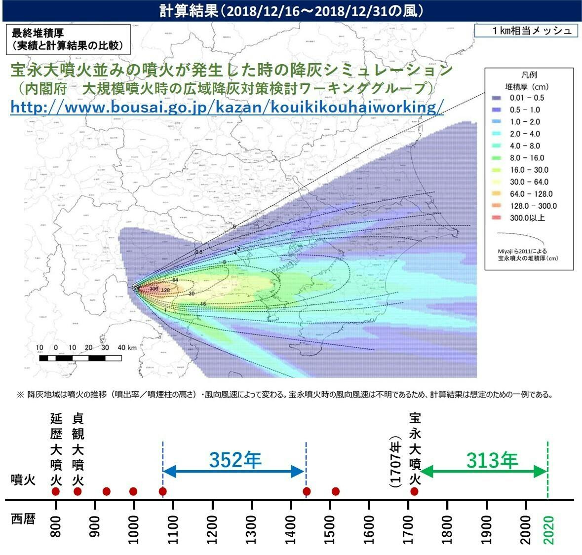 富士山噴火については、少し前になりますが、今年4月に政府の検討会が「富士山噴火による降灰シミュレーション」を発表しました。写真は内閣府発表によるシミュレーションです。富士山からは新宿まで約100 km、横浜まで約80 kmしか直線距離はなく、意外に近い山です。宝永大噴火レベルの噴火が起きると新宿では約10 cmの火山灰が堆積して交通網がマヒする可能性があるようです。