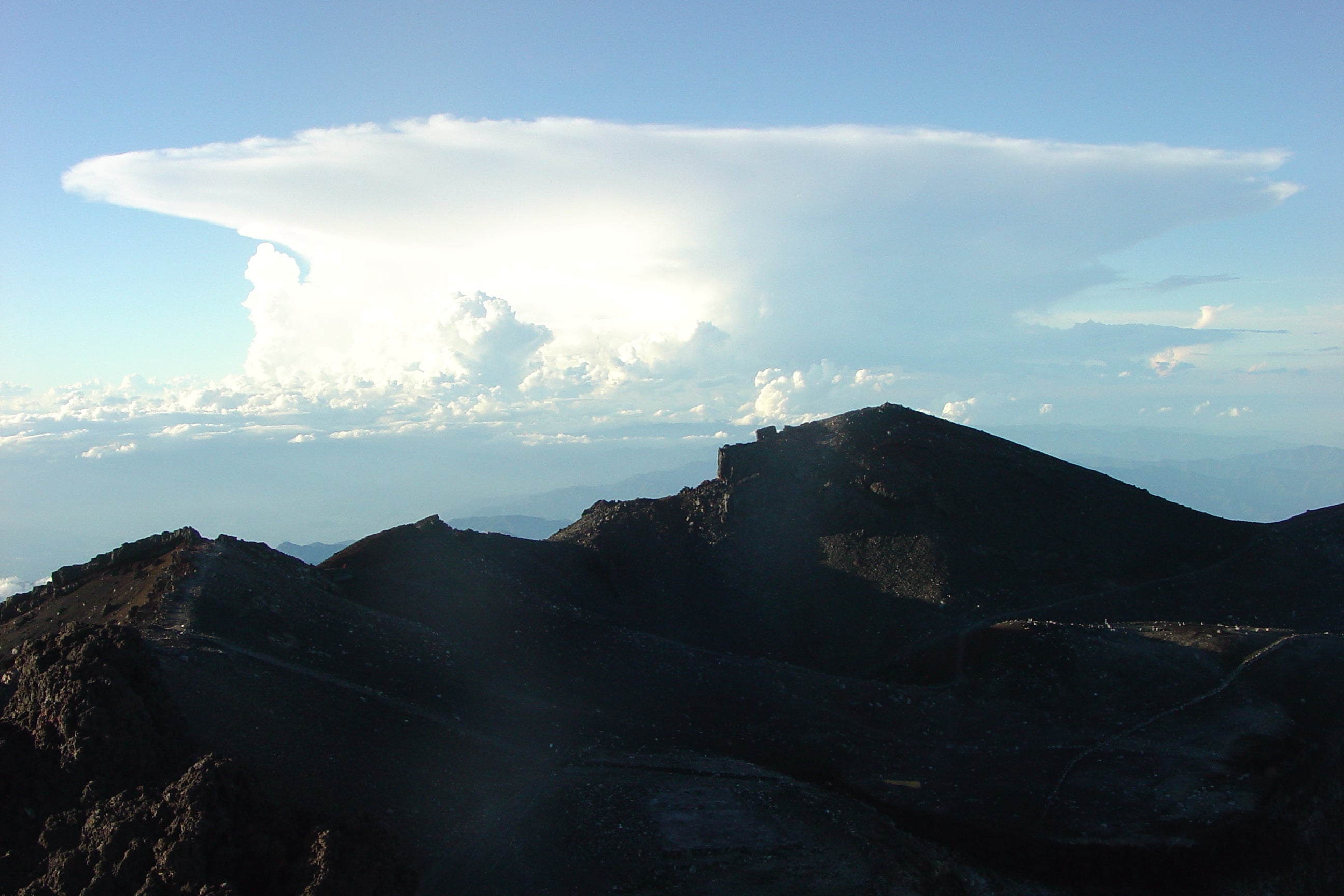 さて、この写真は測候所あたりから北の方角(やや東?)に見えた入道雲を撮ったものです(2015年7月22日に撮影)。入道雲と言えば、モクモクと湧き上がってどこまでも高くなっていくような印象を持たれるかも知れませんが、実は天井があります。緯度によって違いますが、だいたい高さ10km前後に対流圏界面というものがあって、そこで対流は止められてしまいます。あまりに勢いが強いと天井を突き破って雲が ”ジャンプ” することもありますが、多くの場合は横へ拡がっていきます。それが写真の「かなとこ雲」です。と言っても鍛冶屋さんが少なくなった現代では、あまりイメージも湧かないでしょうか?