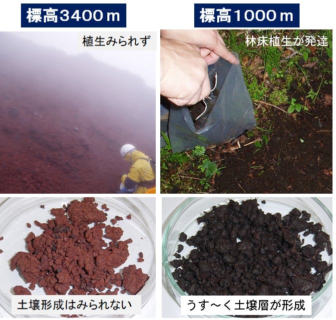 富士山にもたくさんの微生物がいます。但し、山頂付近は限られた場所に地衣類や蘚苔類がわずかに生えているばかりで、スコリアに生息する細菌数もそれほど多くはありません。地中の微生物は植物や動物の遺骸などを分解する“お掃除屋さん”のイメージが強いのですが、その他にも大切な働きがあります。そのひとつが大気に微量に存在する硫黄系ガスの分解です。そのガスは硫化カルボニルと呼ばれ、火山ガスなどの自然発生源の他に、化学繊維の製造や化石燃料の燃焼といった人為起源からも大気に放出され、環境への影響も懸念されています。山頂付近のスコリアで硫化カルボニルの分解を調べると、細菌密度の低いこの辺りでは分解はとてもゆっくりとした速度です。しかし、登山道に沿って何ヶ所かの高度で採取したスコリアの分解速度を比較してみると、大きな変化が現れるのに気が付きます(富士山は国立公園に位置するので、採取には特別の許可が必要です)。それは、森林限界を過ぎ植物が生えてくるのに呼応して、スコリアの表面にまとわりつく様に発達してくる褐色の土壌の存在です。この様な場所では数多くの細菌が確認され、硫化カルボニルの分解速度も一気に早くなります。植生の発達、微生物の活躍、そして土壌の形成と云う、自然界の成り立ちの一側面を富士山でみることができるのです。そして富士山の過酷な環境下では、このうすく覆っている土壌が作られるのに300年余りの歳月を要していることも、宝永噴火の史実から知ることができます。