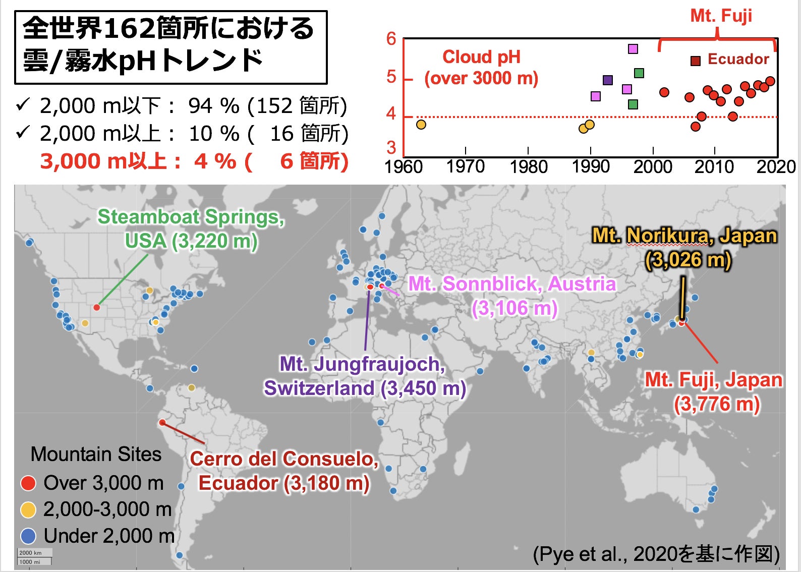 世界の山岳域ではpHが4よりも高いですが,富士山と乗鞍岳ではpHが3より小さく,酸性の強い雲が生成していることを示しています.