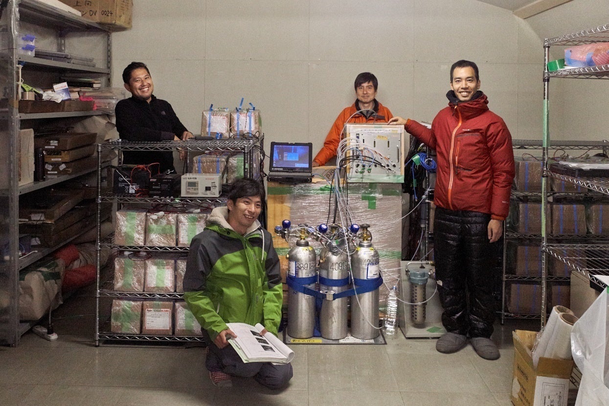 現在、NPO法人富士山測候所を活用する会の尽力により、富士山頂の気候が安定している夏期の2カ月間のみ、富士山頂にある旧富士山測候所に商用電源が供給されます。国立環境研究所は、測候所に商用電源が供給されるわずかな期間に100個のバッテリーを充電し、それらのバッテリーの電力のみで富士山頂の大気中CO2濃度を自動で通年観測できる省電力型のCO2濃度観測装置を作りました。この装置の作成によりCO2濃度観測の空白域であった日本の中緯度のCO2濃度データを取得することに成功しました。