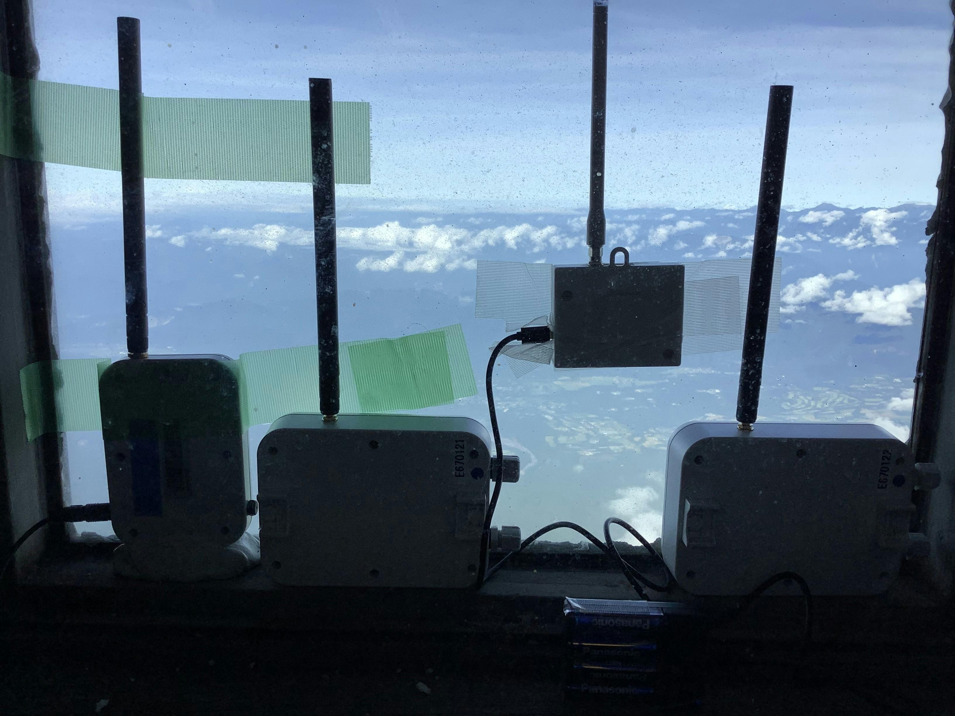旧測候所には小さなサイズですが窓はいくつかあり、二重窓になっています。この、貴重な窓、我々研究者が滞在しているときの健康面、精神面に役立っているだけではなく、貴重な観測場所になっています。建物屋外は厳しい気象環境のため、計測機器の設置には頑強なハウジングなどが必要です。しかし屋内の窓であれば、電波、光は通すことから、アンテナや、ソーラーパネルが比較的手軽に設置できるのです。写真でも複数のグループが機器を設置しているのが分かると思います。この貴重な窓、ガラスが割れてしまったりすると下界とは比較にならないほどの修繕費がかかります。我々NPOが旧測候所を借用してからは満足に修理はできず、応急処置のために窓を潰してしまっている状態です。窓の復活が今後なされれば多くの機器やソーラーパネルを窓に設置でき、より多くの通年観測をするグループが増えるのではないかと考えてます。