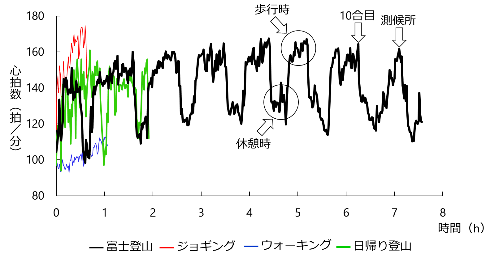 上のグラフは,①富士登山(黒線),②低地でのジョギング(赤線,時速9~10kmで40分程度),③低地でのウォーキング(青線,時速5~6kmで1時間程度),④日帰り登山(緑線,上りのみの心拍数を記載)をした際の心拍数の比較をしたものです.