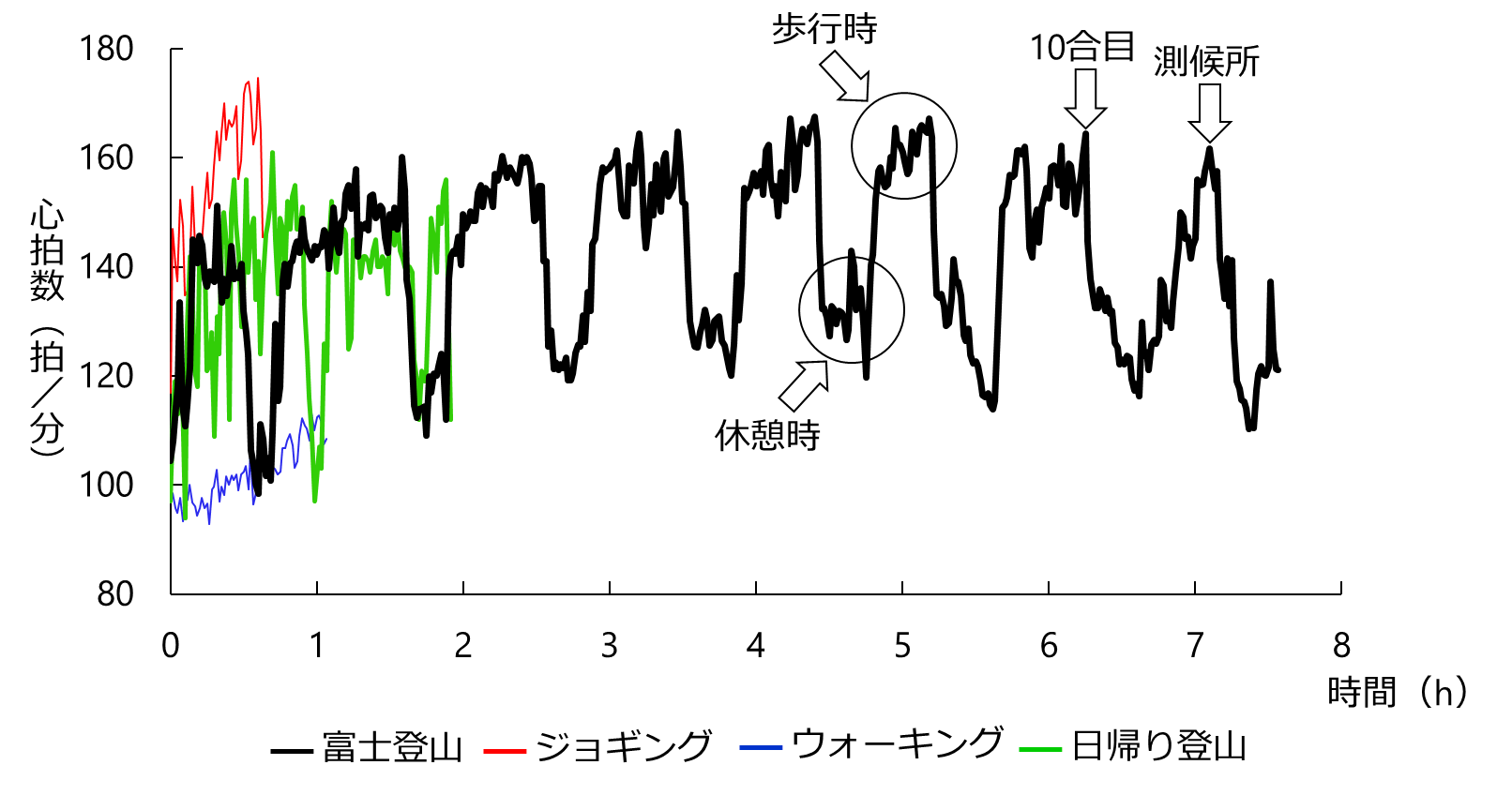 そこで富士登山のためのトレーニングとしておススメなのが,日帰り登山です.日帰り登山時の心拍数は,富士登山時と同程度まで上昇しており,なおかつジョギングやウォーキングよりも運動時間は長くなります.また運動様式の観点から見ても,より実践に近いトレーニングができます.