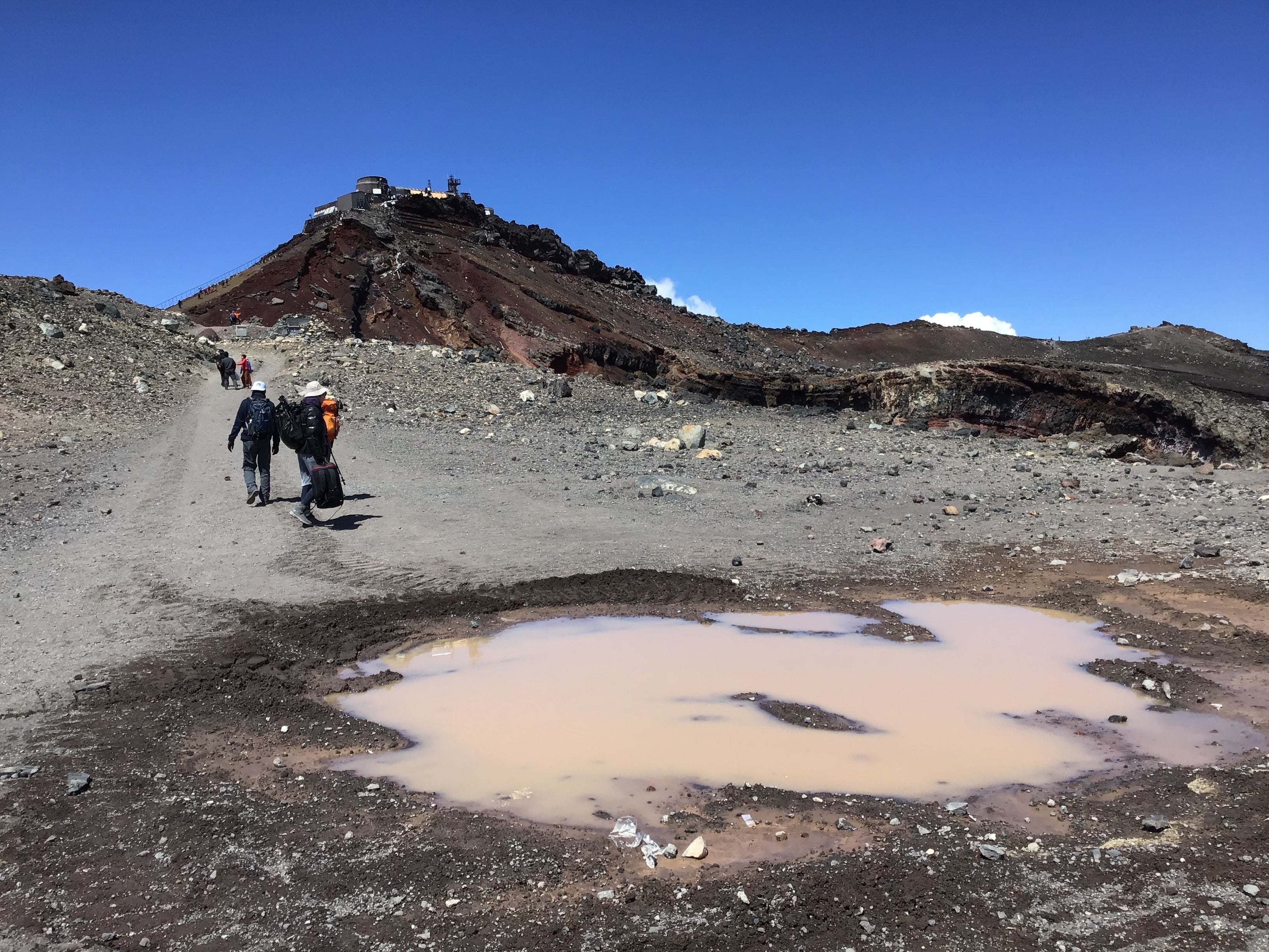 わずか1日と少しで目標金額の2割に到達することができました。ご支援の皆さまには厚く御礼を申し上げます。引き続き、お知り合いの方々へのご支援依頼をお願いできたらと存じます。富士山は火山でできた山なので、水が浸透しやすい土壌です。しかし、写真のように、池ができる場所があります。この池は、コノシロ池と呼ばれており、下に永久凍土があるために水が溜まると考えられています。本州で唯一永久凍土がある場所と言われている富士山。本NPOにおいても筑波大学のグループが富士山の永久凍土調査を長期にわたって行っています。温暖化研究にも大いに関係する本研究、今後も目が離せません。徒歩登山の研究グループも、10合目に到着し、このコノシロ池までくると、旧測候所が目に見えるところまで来るので「あともう少しで到着だ」とほっとするものです。このコノシロ池の前は環境省トイレがあります。トイレの管理人さんとおしゃべりするのも研究登山の醍醐味です。