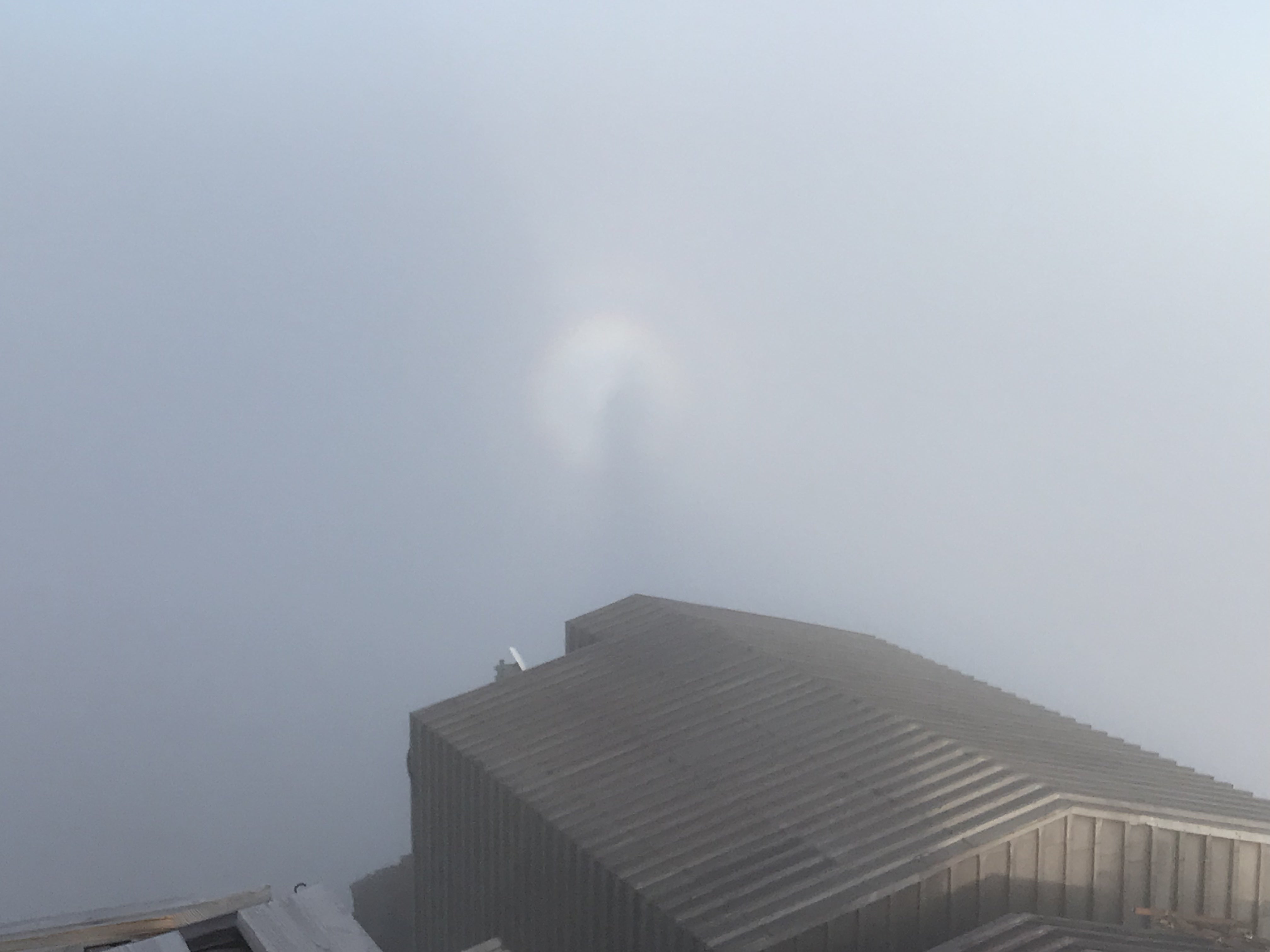 クラウドファンディングを開始してから1週間もたたないうちに目標金額の三分の一となる大台に到達いたしました。みなさまのお力添えに深く感謝いたします。引き続きみなさまのお力添えをお願いいたします。山頂で研究活動をしていると日常ではあまり見られない景色に遭遇します。写真はブロッケン現象といい自分の影の周りに虹ができる現象です。ブロッケン現象はしばしば山岳で見られます。