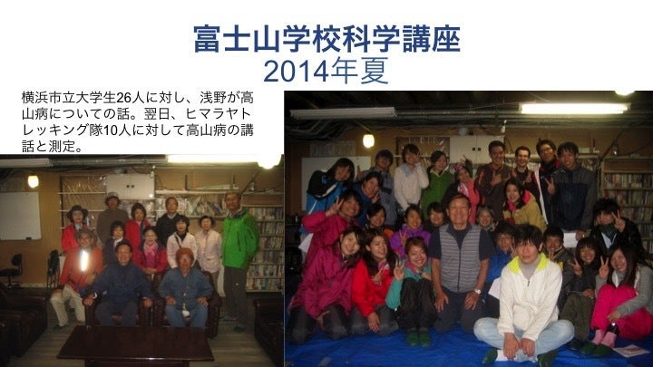 2005年11月27日に設立し、翌年4月に内閣府ににより認定されたわがNPO法人”富士山測侯所を活用する会”は、研究を主軸としているが社会への啓蒙貢献も重要な使命としている。そこで2006年1月に第1回の富士山学校科学講座を都内で凡そ50人の聴衆を得て開講した。当会の副理事長の三浦雄一郎校長による特別講演”エベレストにかける夢ー究極のアンチエイジング”および理事長の浅野勝己による”山登りの健康への效用”について分かりやすく解説した。その後、2007年よりほぼ毎年の8月に測侯所2号庁舎の応接間において”日本一高い場所での高山病の話”および大気化学などの最新研究成果の報告がなされた。さらに2010年8月より大学生へのセミナーが定期的に開催された。すなわち江戸川大学の学生15人および横濱市立大学の学生20人を皮切りに、横濱市立大学はその後2016年まで2年毎に計4回〔毎回約30人)参加され、高山病の話題をはじめ大気化学などの最新研究成果の解説を聴く好機を得たのである。(右の写真参照)さらにヒマラヤへのトレッキング登山グループへの高山病対策についての話題提供も行って来ている。〔左の写真参照)