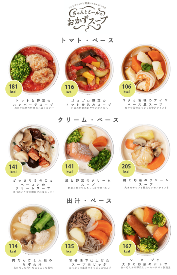 スープのベースは3種類「トマト」「クリーム」「だし」です。それぞれのスープにはたっぷりの野菜を煮込んでありますが、メイン具材を「肉」「魚」「野菜」とし、スープ3種類 × メイン具材3種類、合計9種類のスープをご用意いたしております。(写真は試作品の画像であり、イメージ画像になりますので現物は少し異なり更にグレードアップしてございます。)