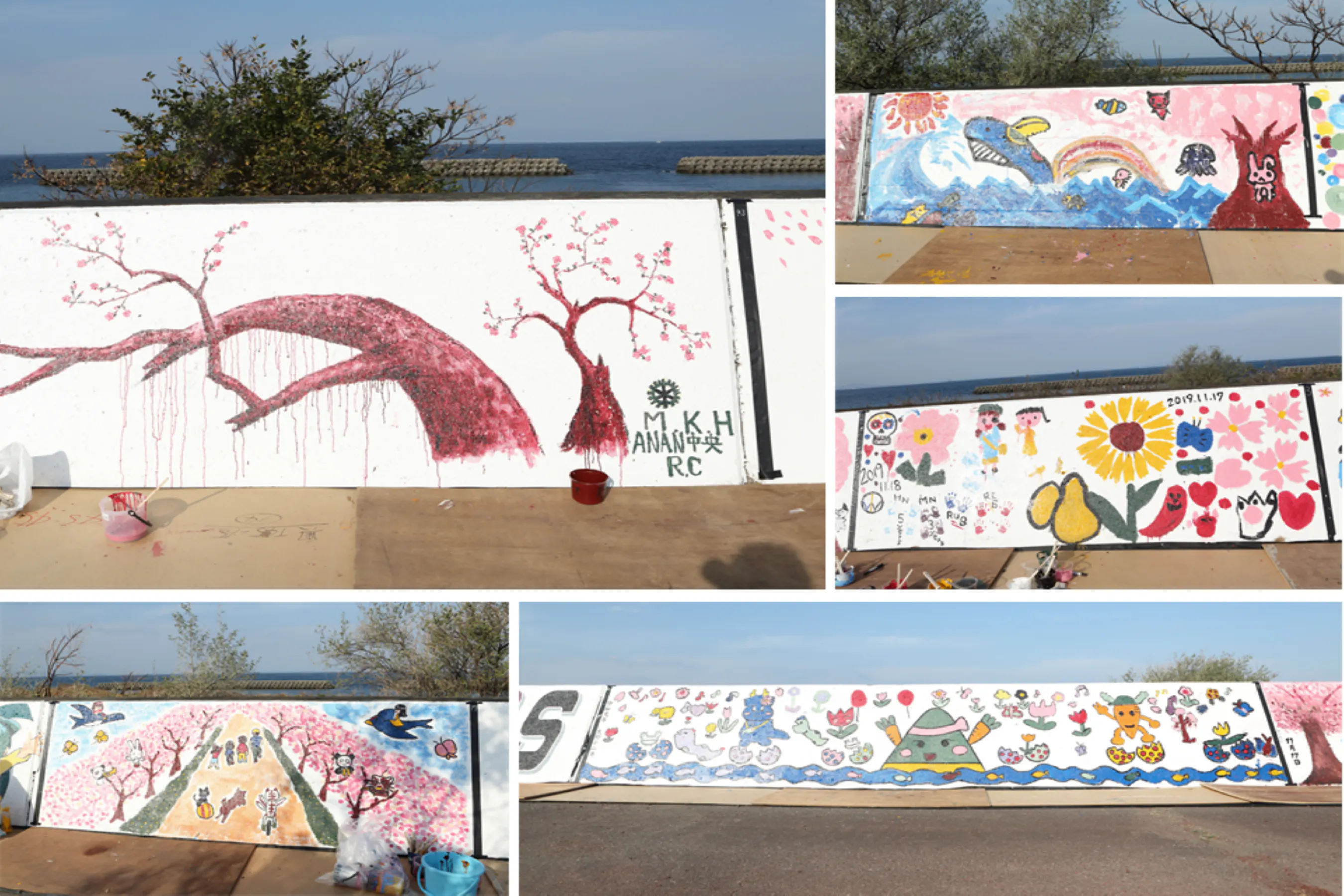 2020/11/12 18:20■令和2年11月8日(日)に令和2年度の「壁画再創造」を実施しました。 撮影・編集は カメラマンの井澤 智さん(那賀川町)会場設営完了後参加者の皆様には①事前検温の実施②参加者名簿の提出③マスク着用④アルコール消毒の利用の協力をお願いし、新型コロナウイルス感染拡大予防の対策に努めての開催となりました。今年も昨年と同じく天候に恵まれ、那賀川町内外からこのプロジェクトに賛同してくださった約300人の参加者が集まり、「夏」をテーマにした壁画を200mにわたって描きました。参加者は各区画購入数分(1区画:縦1.25m×横3.3m)にハケと水性塗料を使い、家族や友人たちとペンキで服を汚しながら、楽しく和気あいあいとした雰囲気の中で壁画を描いていました。そして、ヒマワリ・阿波踊り・参加者の手形で描かれた花火・金魚・バーベキュー・高校野球など、数多くの素晴らしい壁画が出来上がりました。■作品紹介(一部抜粋)徳島県立南部テクノスクール塗装技術科の訓練生の作品■最後に今年の実施も終わり、昨年と合わせて合計400mの「壁画再創造」が完了しました。出島海岸の防潮堤には色鮮やかな壁画が連なり、写真撮影や散歩で楽しめる場所になってきております。また、地元のボランティアの方による防潮堤周辺の草刈りが進み、見間違えるほどに景観が良くなり、那賀川町の観光資源になりつつあります。ただ、2.8㎞の「壁画再創造」完走が目標である私たちにとって、まだまだ道半ばであることには変わりありません。しかし、これからもこのプロジェクトを継続していく中で、認知と支援の輪を広げ、多くの皆様にこのプロジェクトに関わり、「壁画再創造」に参加していただけたらと思っています。そして、次世代の子供たちに語り継いでもらえたらと考えています。今後ともこのプロジェクトをご支援・ご協力のお願いをするとともに温かく見守っていただけたら幸いです。これからもよろしくお願いします! 出島壁画再創造プロジェクト実行委員会 委員一同 もっと見る