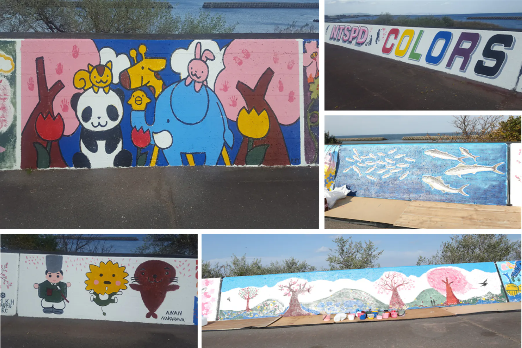 また、テーマは「春」ということで、子供ならではの感性が光る花や動物の他、繊細なタッチの川魚、日本画を思わせる桜、グラフィックアートの様な壁画が次々と完成しました。開始時刻の9時の時点では、下塗りの白色が塗られているだけだったのが、終了時刻の15時には防潮堤はカラフルな壁画で彩られ、今後この場所に訪れた人の目を引くものになりました。