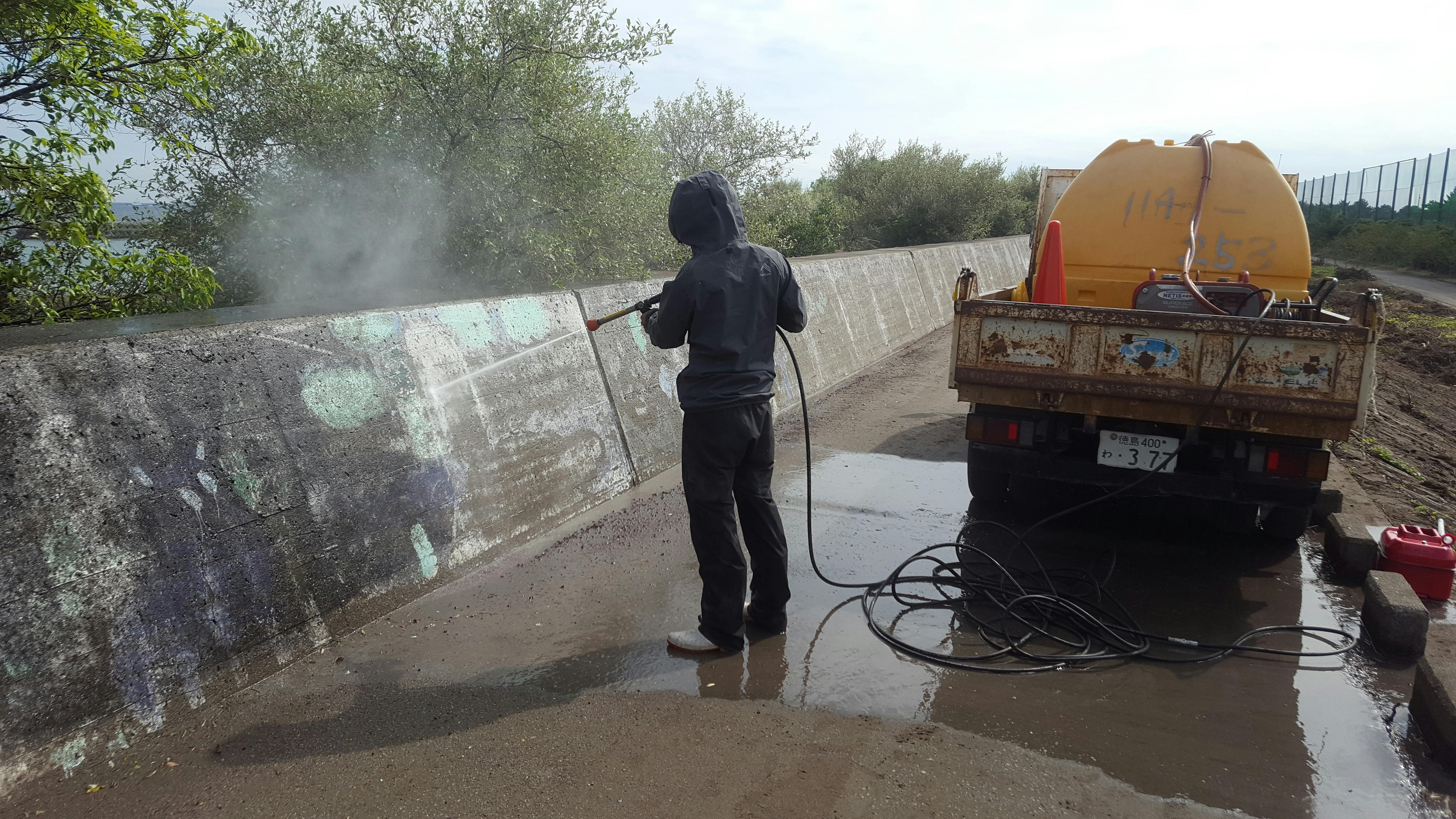 昨年度に引き続き、「徳島県立南部テクノスクール塗装技術科」の訓練生に協力を依頼し、協働作業にて実施しました。訓練生は職員に高圧洗浄機を用いての水洗いを丁寧教えてもらいながら、実践していました。