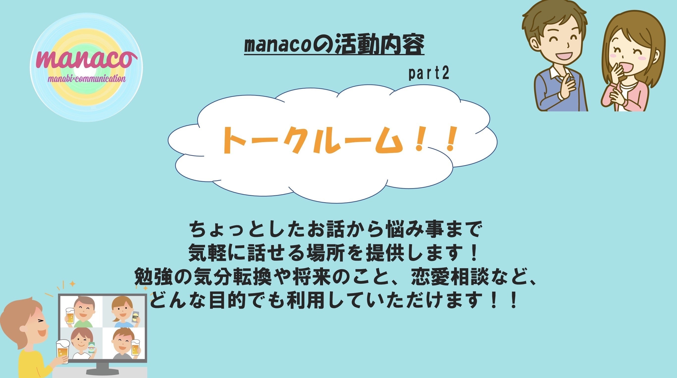 manacoはすべての子どもたちに寄り添った教育をするために、学びとコミュニケーションを大切にし、安心できるオンライン上の居場所を提供することを活動理念に掲げています。