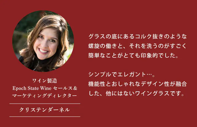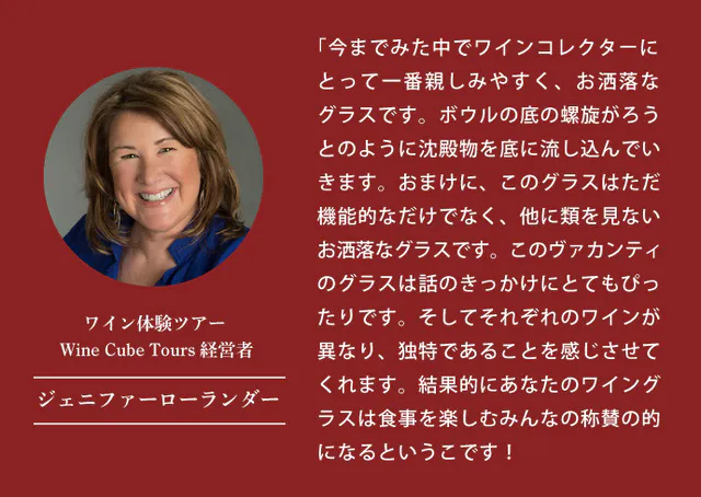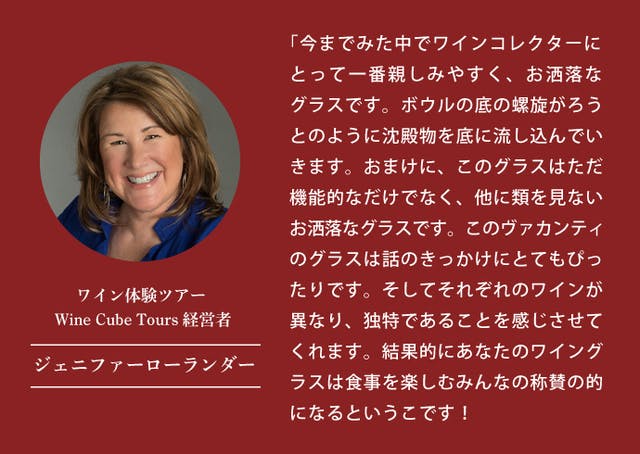ワインには色々な産地、ぶどうの品種など、1つ1つに特徴があり、選ぶワインによって、それぞれの人生を楽しむような体験をすることが出来ます。そんなワインの甘みや酸味など、繊細な味を美味しいところだけ味わって、もっとワインの時間を楽しく、感動的な体験をしていただきたい、というVacanti夫妻の願いから誕生したワイングラスです。