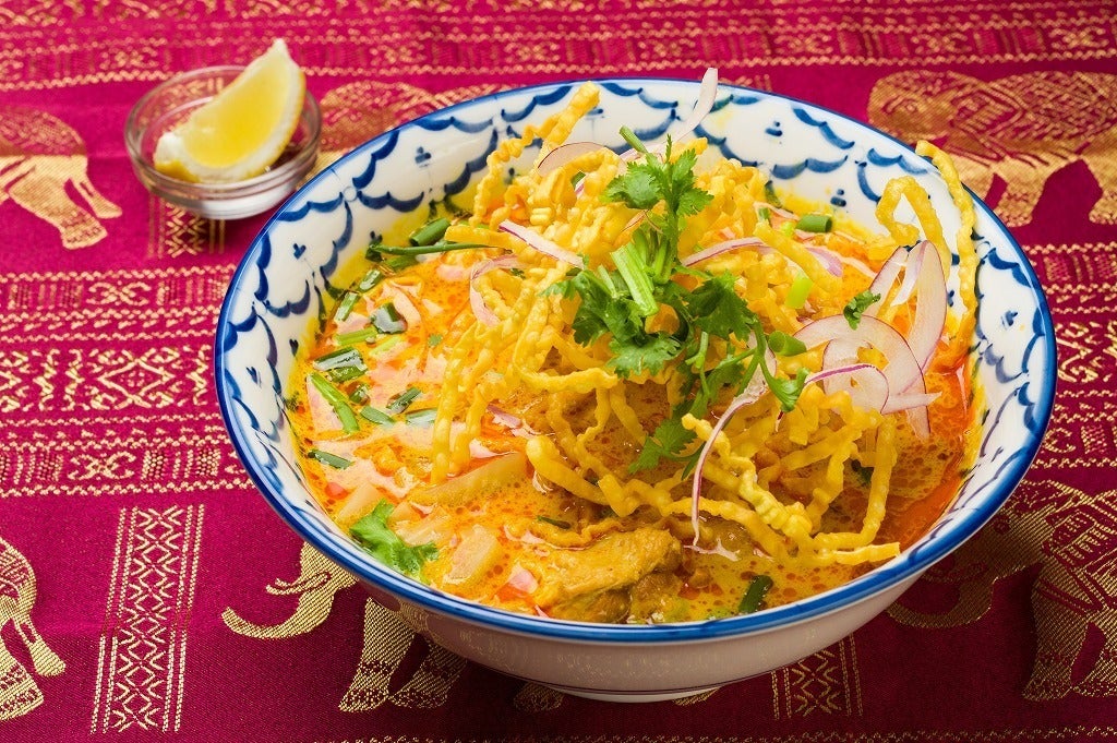 当店の一押しタイ料理はタイ北部チェンマイの名物料理、カオソーイ。スパイシーながらマイルドさも併せ持つ、くせになる美味しさです。麺の上に揚げた麺が載っていて、食感も豊か。