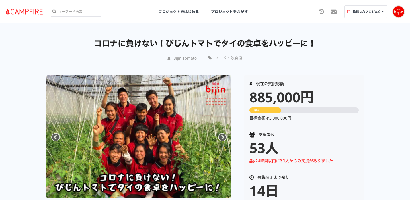 4日目が終了いたしました!ここまで、134名、1,878,500円のご支援をいただき、誠にありがとうございます!目標としている3,000,000円まで、残り38%となりました。7/19(日)までの11日間、引き続きよろしくお願いいたします。「東南アジアで農業する」という夢が農業をはじめて半年で実現し、「タイで一番美味しいトマトを作る」という夢も3年かけて実現しました。「東南アジアで品質、生産量共に一番のトマト企業になる」、この目標を掲げてこの2年全速力で走ってきましたが、心の中にあったのは、いつも「全従業員の物心両面の幸福」「お客様の食の幸福への貢献」「環境保護と子供達の未来の創造」。クラウドファンディングをはじめて、ここにさらに、新たな気持ちが加わりました。今回直接的、間接的に、本当にたくさんのみなさんにご支援をいただき、今まで感じたことのない感覚が芽生えてます。「自分の夢の実現を通して、応援してくださる沢山のみなさんのお気持ちに、恩返しをしたい」心ををより定めて、自分が信ずる道をひたむきに突っ走ることが、こうして支援してくださったみなさんへの、最大の恩返しになるのかな?と考える、5日目の朝です。それでは、5日目も引き続き、よろしくお願いいたします!