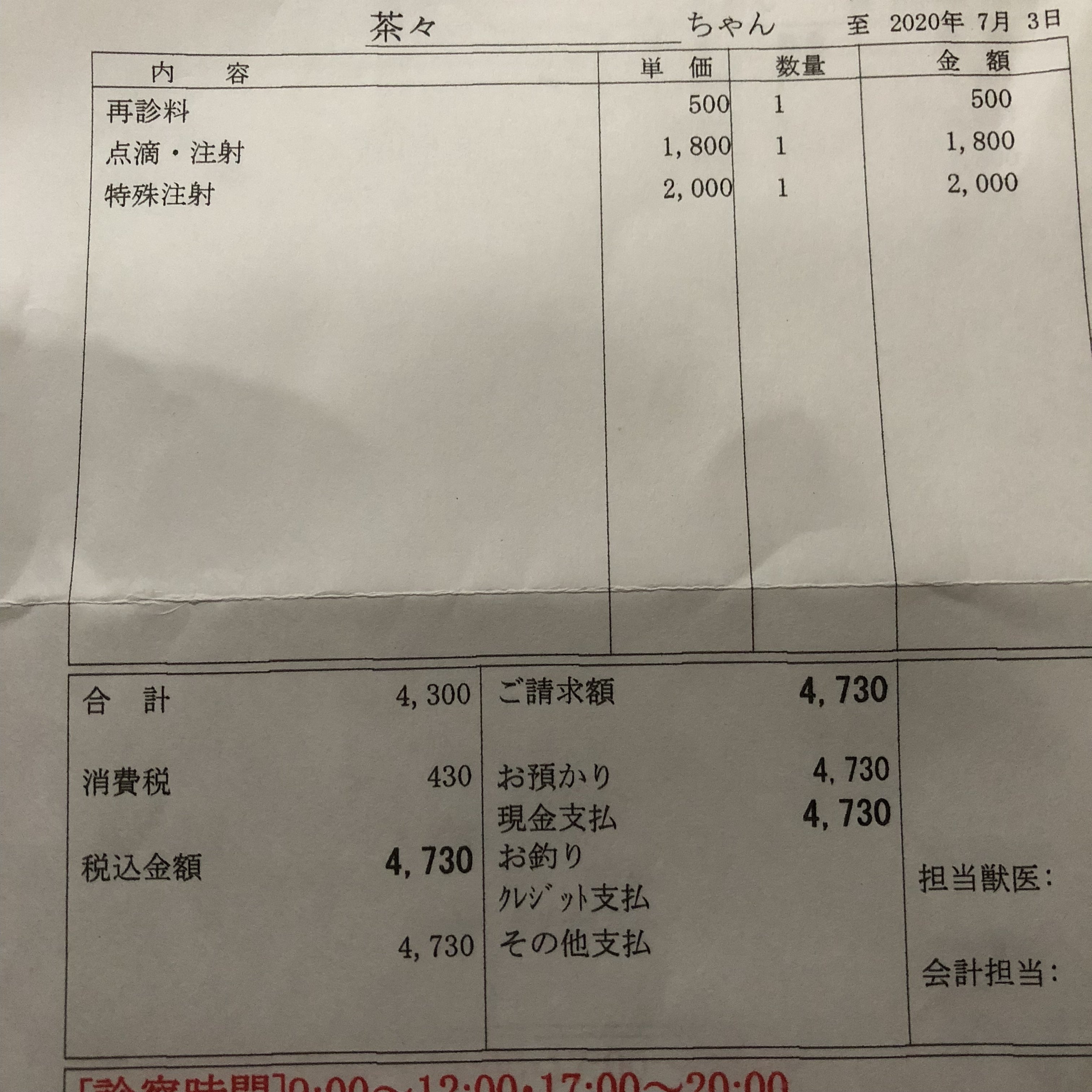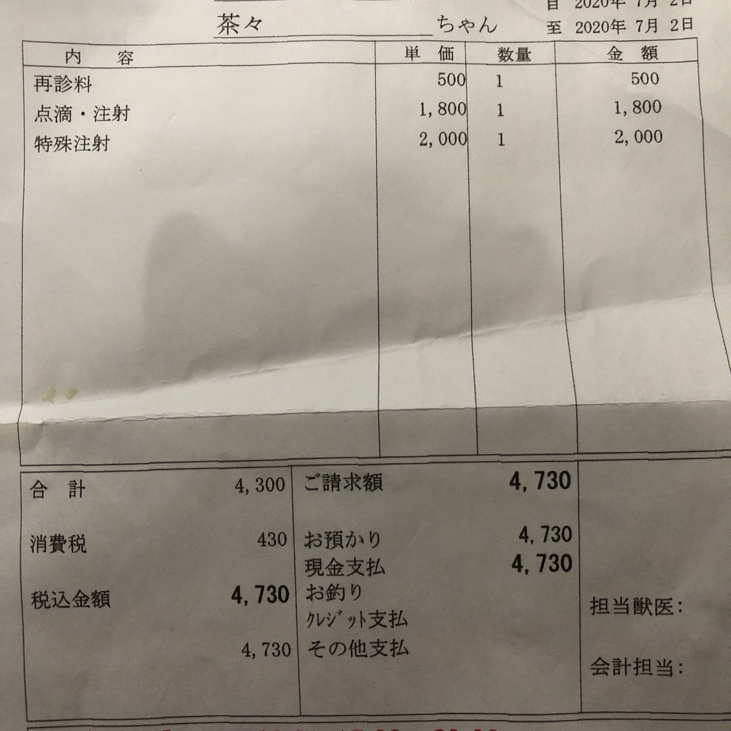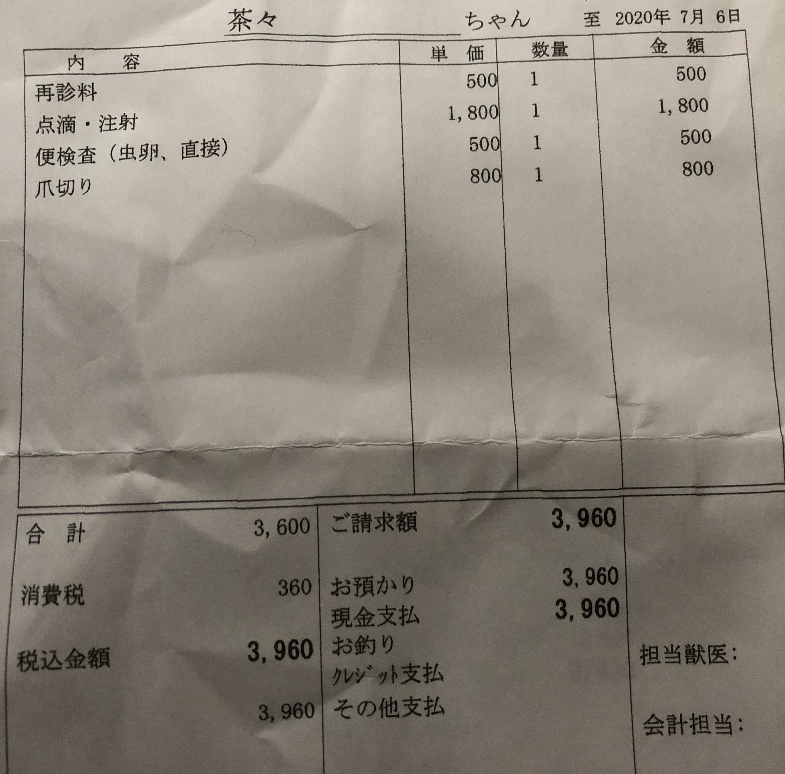 4日の検便分を忘れておられた為、6日の分に検便費が入ってます
