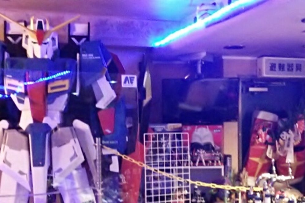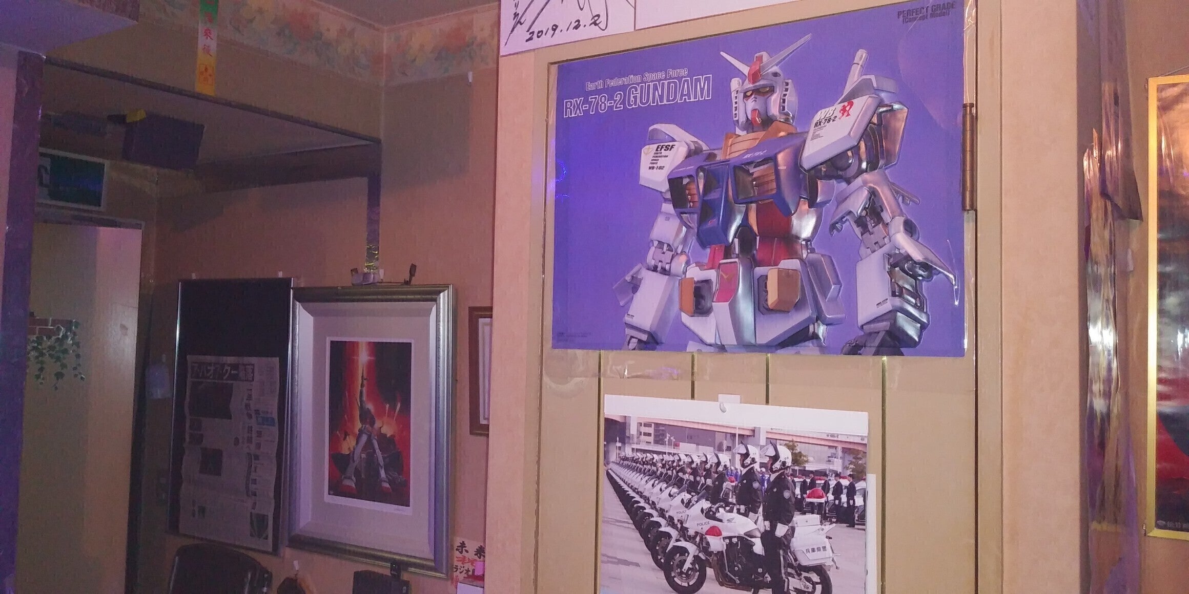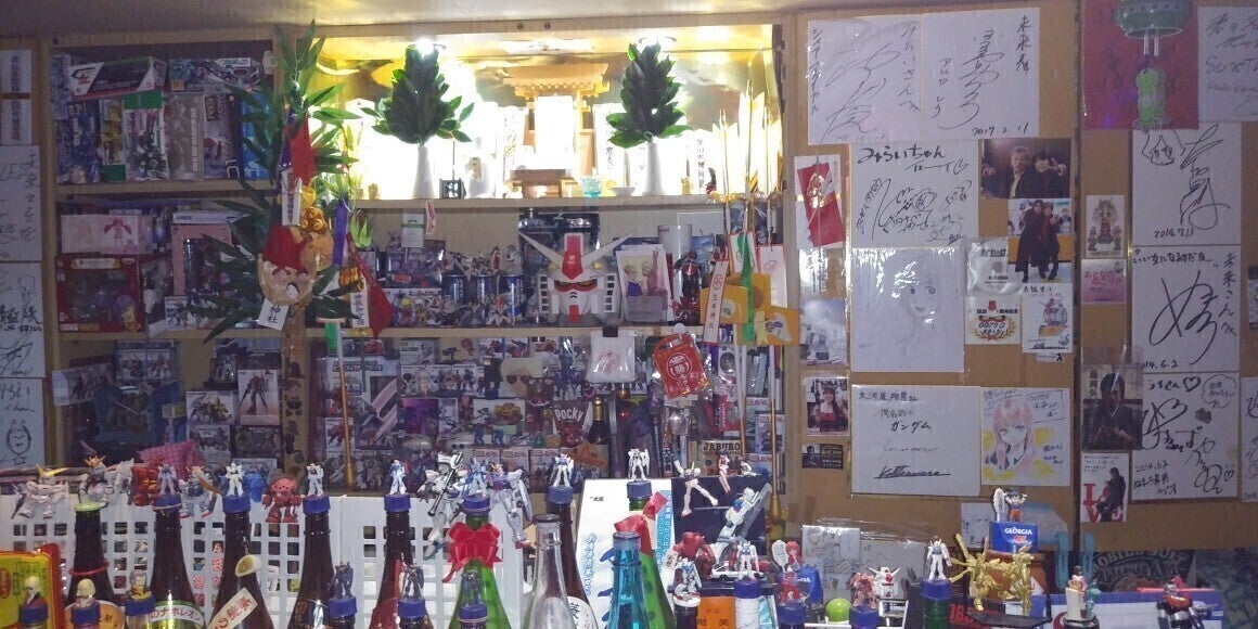 開店にするにあたり、ラジオのパーソナリティーをしてるときに、宣伝させて頂き、色んなグッズやポスターを頂き、1/10のZガンダムを頂いたり、声優さんにサイン頂いたりと、コツコツ集めて築き上げたお店です。