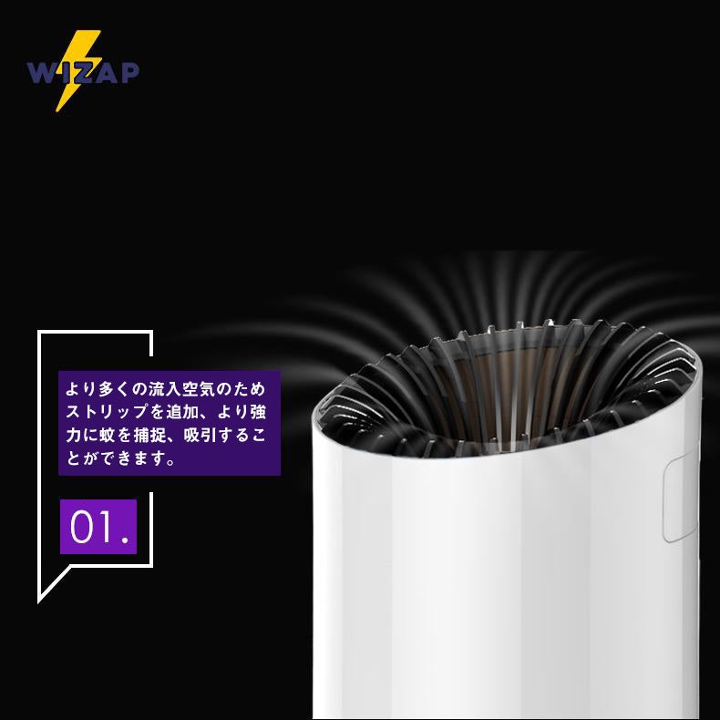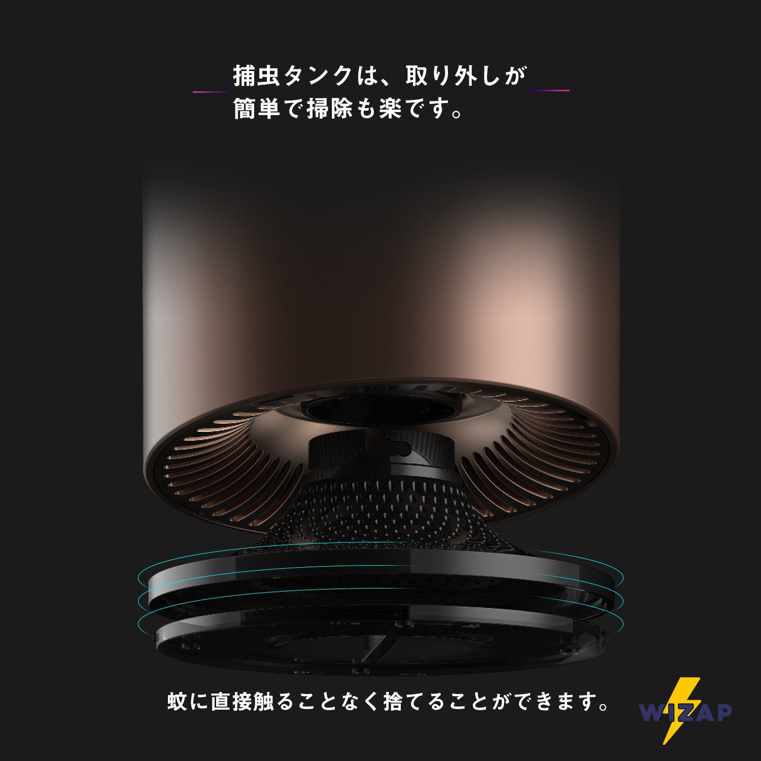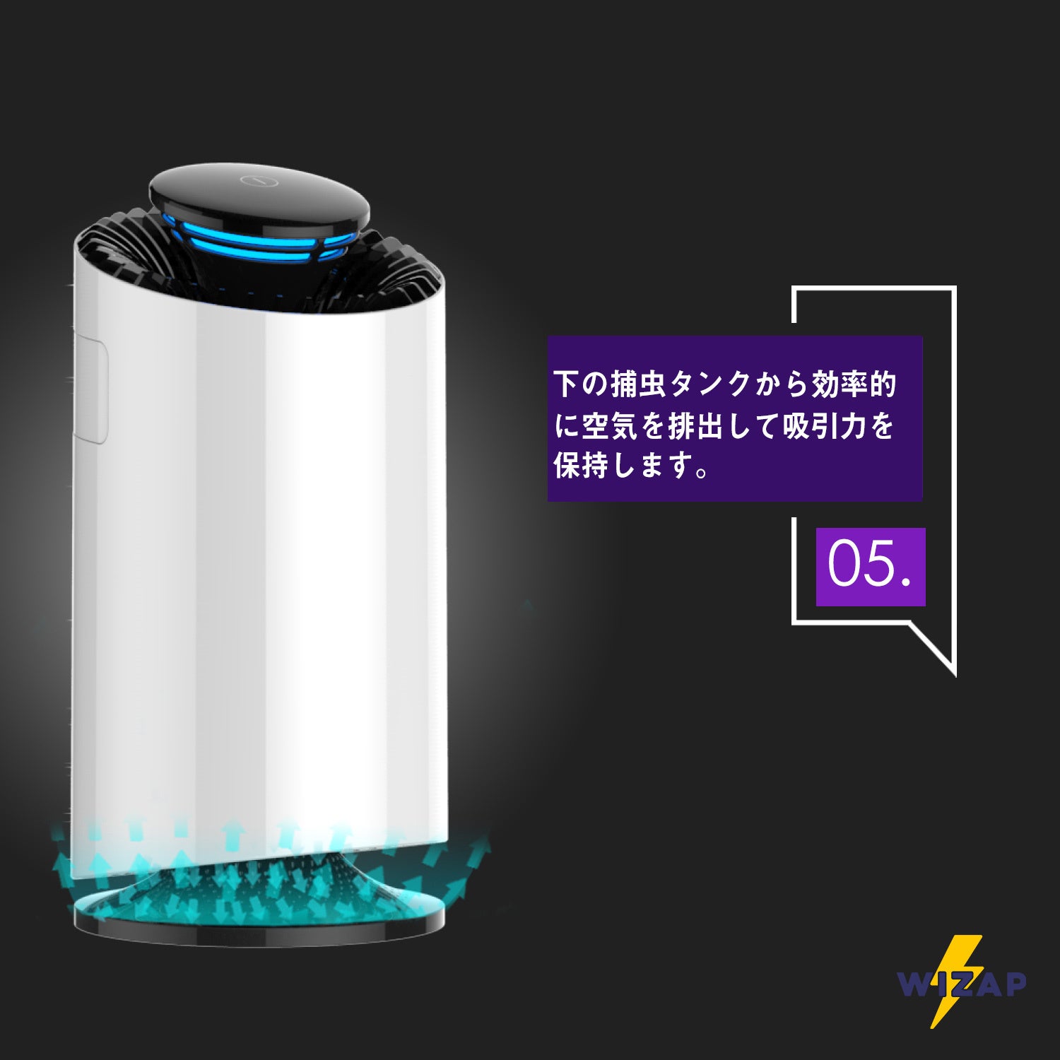 Wizap ™は、2000Rpmの高速ファンのおかげで優れた吸引力を発揮し、60m²以内の蚊や他の昆虫に有効です。吸引は360°全方位で機能します。より効率的で実用的です。