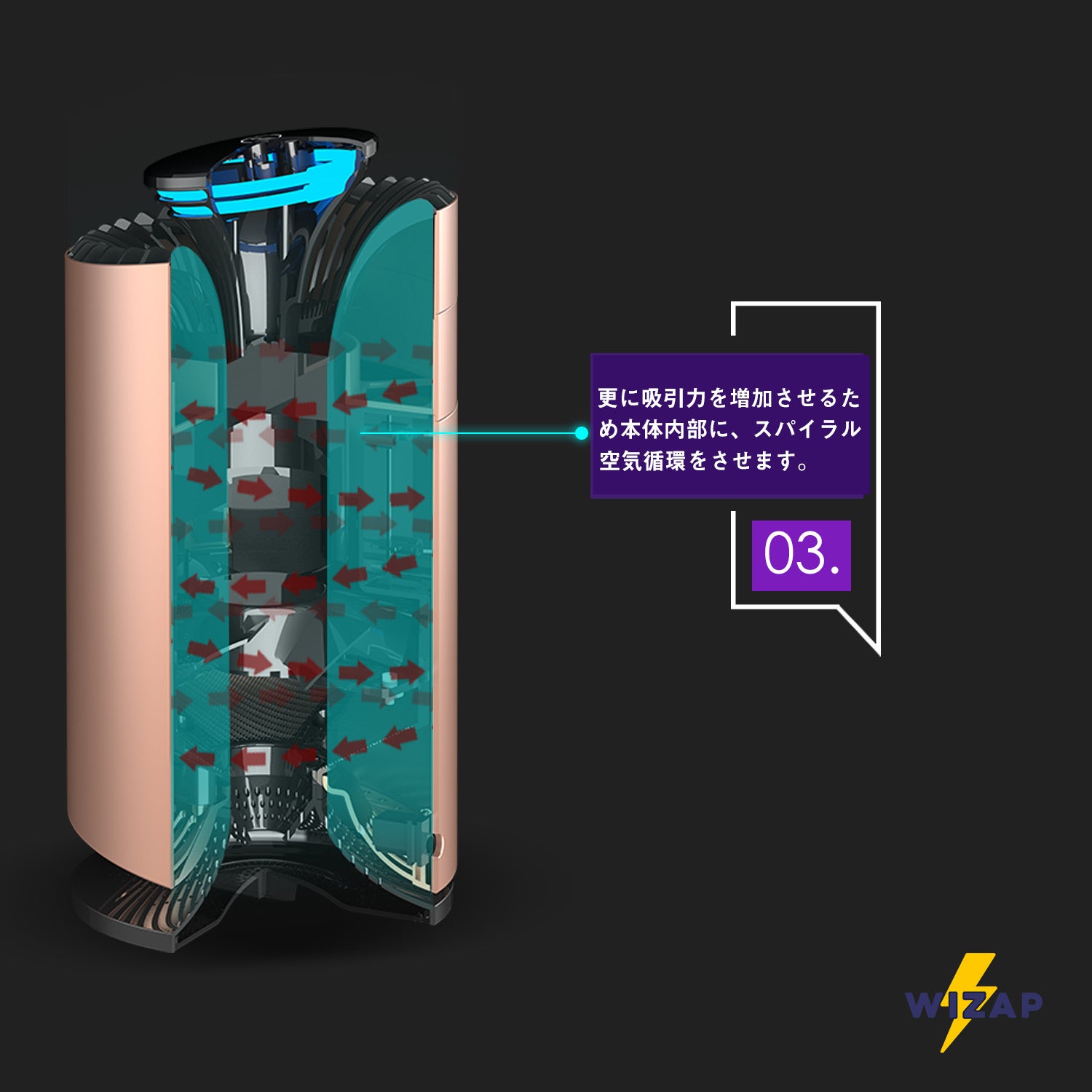 デザインがドレッサー、コーヒーテーブル、ベッドサイドテーブルなど、環境に完全に溶け込むデバイスです。作動音は、Wizap™360は30dbしか出さないので非常に静かです(これはかろうじて聞こえるささやきと同等です)。浅い睡眠をしている人でも、心配なく眠ることができます。