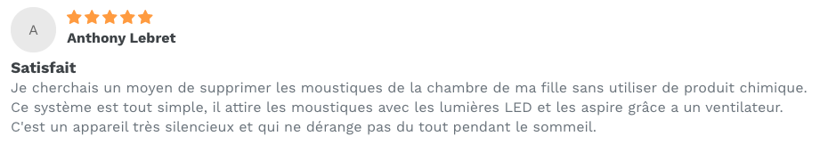 この蚊取り機は、非常にシンプルで、LEDライトで蚊を引きつけ、ファンのおかげでそれらを吸い込みます。非常に静かなデバイスであり、睡眠中に全く邪魔しません。