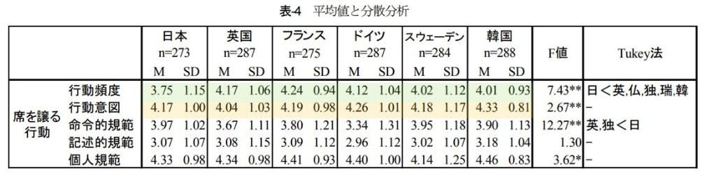 上記のデータから、日本人は席をゆずろうという高い規範意識や行動意図を有しているにもかかわらず,実際の行動にはなかなか移せていないということがわかります。