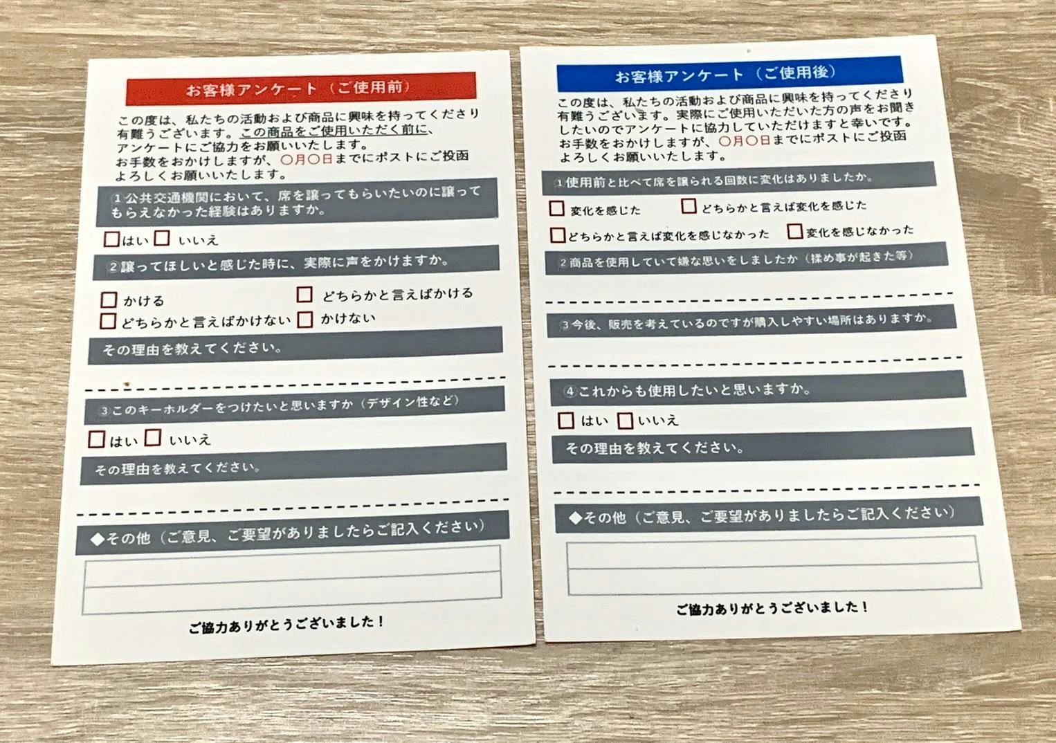 そのため、今回のクラウドファンディングでリターンとしてお送りさせていただくキーホルダー、また、クラウドファンディング後に配布するキーホルダーと一緒に、お年寄り向けのはがきアンケートをお届けします。この方法を用い、お年寄りからのご意見を集めたいと考えています。