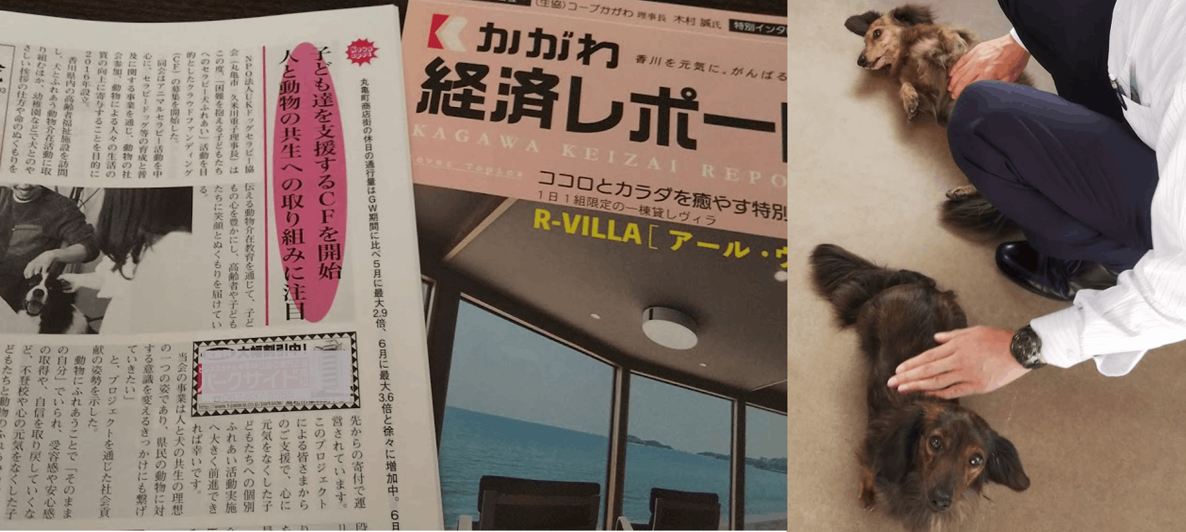 かがわ経済レポート 7月5日号に記事掲載されました。取材時、記者さんに甘えるキッキとクルミ。