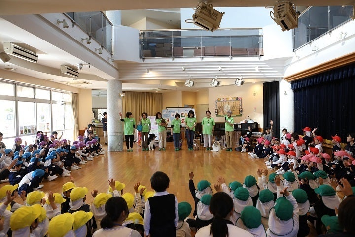 例年訪問する幼稚園では、ホールで年少から年長児まで集まって、まず「犬と友だちになろう」という犬に優しいあいさつの仕方を学びます。