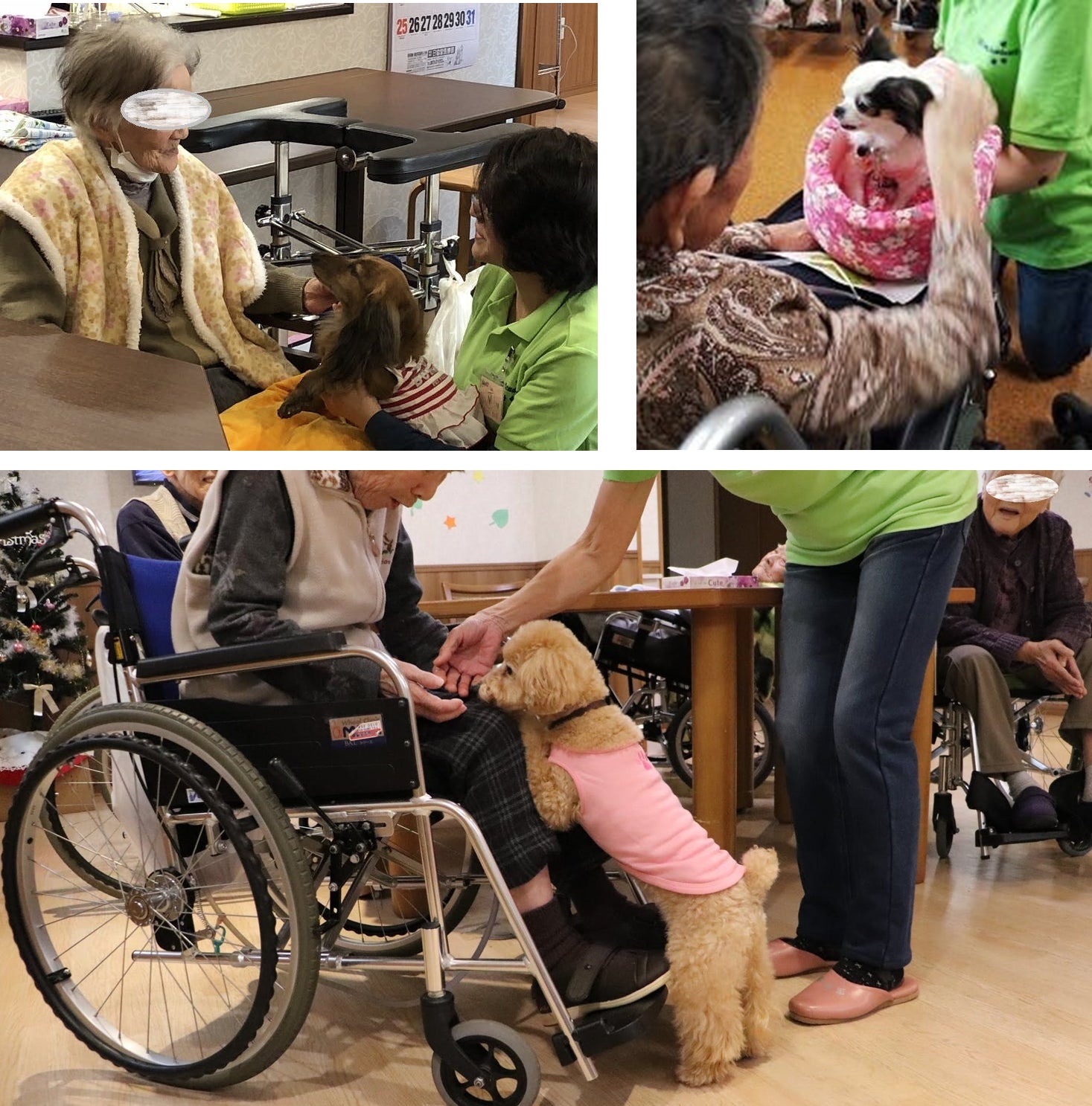 これまでの訪問活動で、のべ2千 人を超える高齢者の皆さまとふれあいました。セラピー犬を連れて会場に入ると、皆さん笑顔でいっせいに声をあげ、早くこっちへと手招きするなどして、大歓迎してくださいます。➡活動ブログはこちら