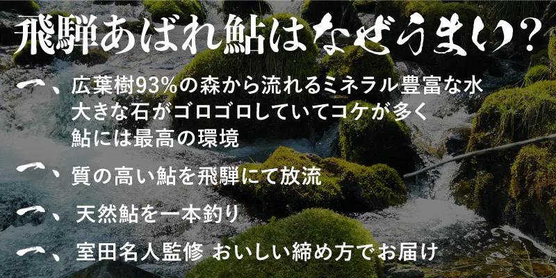飛騨のあばれ鮎とは、暴れるほどに生き生きした、元気で身が締まっていて美味しい鮎を厳選し、特別な鮎に名付けた名前です。