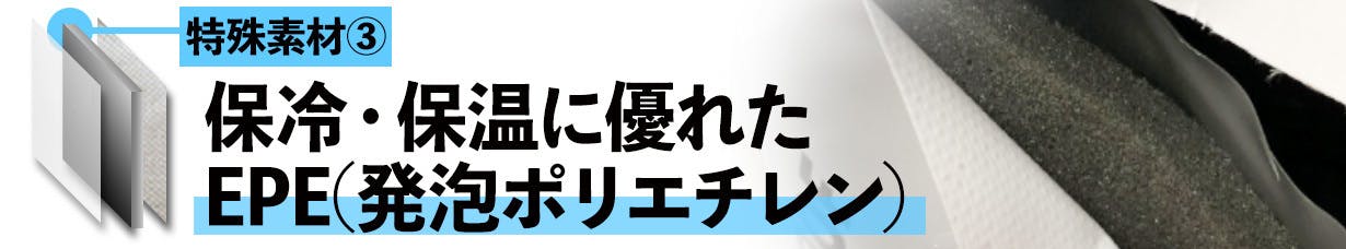 表面と裏地に挟まれたバッグ内部の素材は、発泡ポリエチレンが内蔵されており、クッション材・断熱材となり、また柔軟で曲げやすい特徴があります。