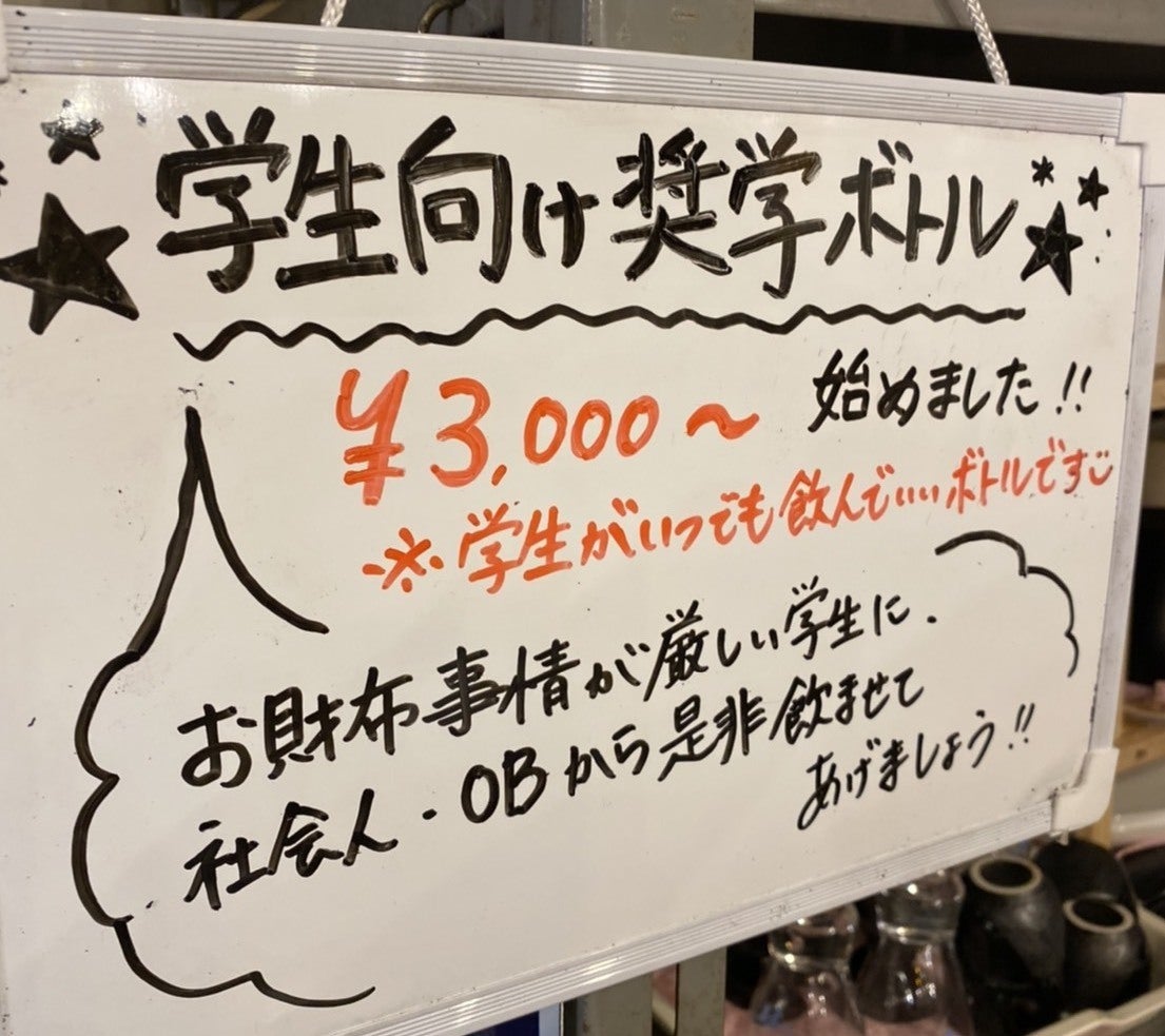 また居酒屋もちだの特徴であり、発祥の商品である「学生奨学ボトル」も大変ご好評いただいております。